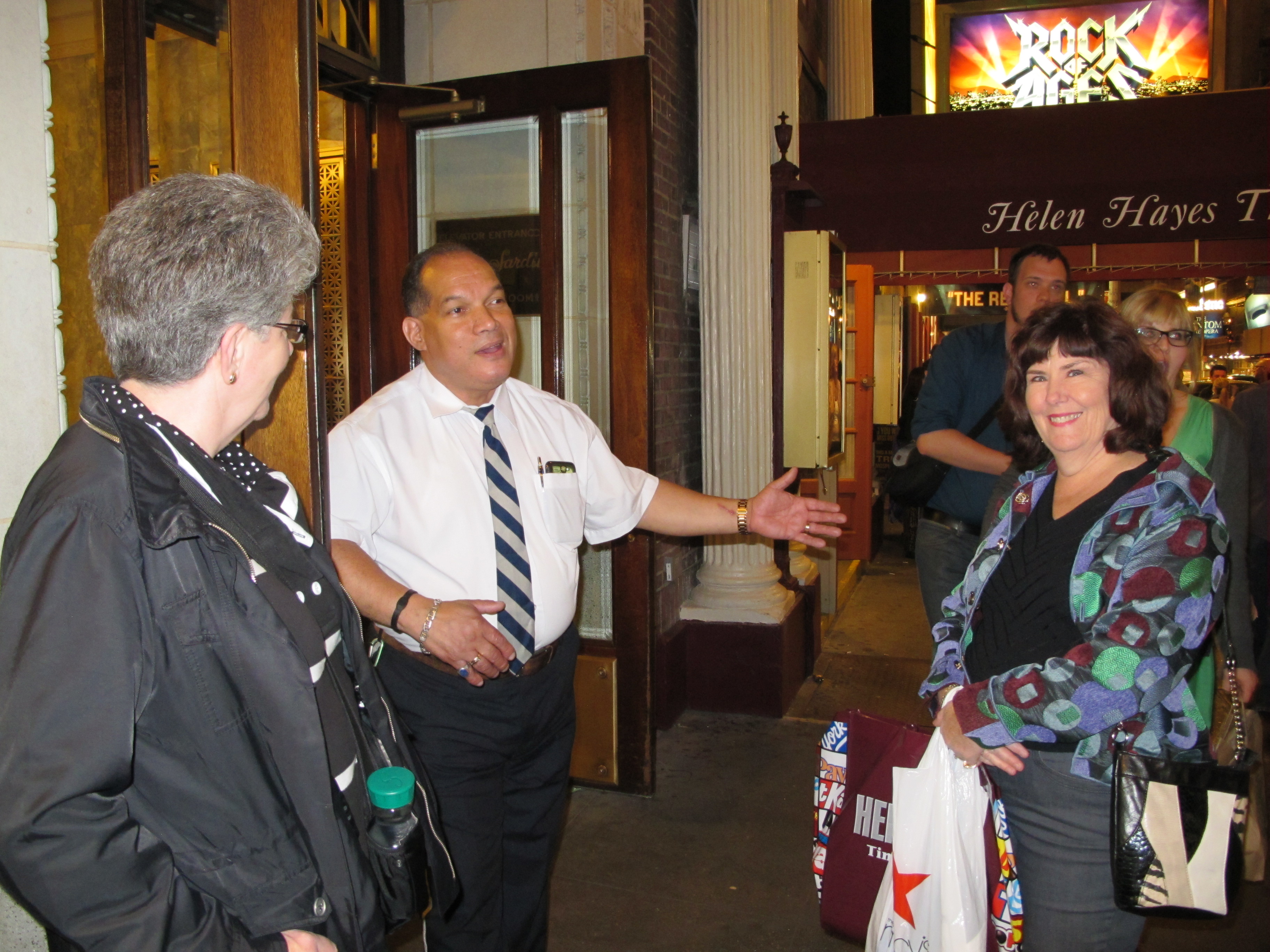 We located the Majestic Theater, where we’ll be seeing Phantom tomorrow night. We passed by Sardi’s, and decided to make reservations for dinner there for tomorrow as well. As we were walking, we could hear a man singiing at the building next door. We peeked in and he started visiting with us, and he told us a little bit about the history of the area. The Shubert Theater is across the street from Sardi’s, and many of the theater buildings are owned by the Shubert family. His name is Victor Palomo, and he is the “Senior Doorman” for this particular building, which is owned by the Shuberts. He then proceded to serenade us with a tune from Man of La Mancha (he had played the priest in the musical when he was in grade school). He sang “To Each His Dulcinea,” quite beautifully. What a treat!