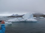 We boarded an amphibious vehicle which entered the lake and took us around so we could see the numerous icebergs up close. One of guides allowed us to hold a piece of glacial ice, then broke some off so we could each taste it. All of Iceland’s drinking water comes from glaciers, and does taste quite good. Although the glacier looks white, and some of the bergs look blue,the ice is clear.