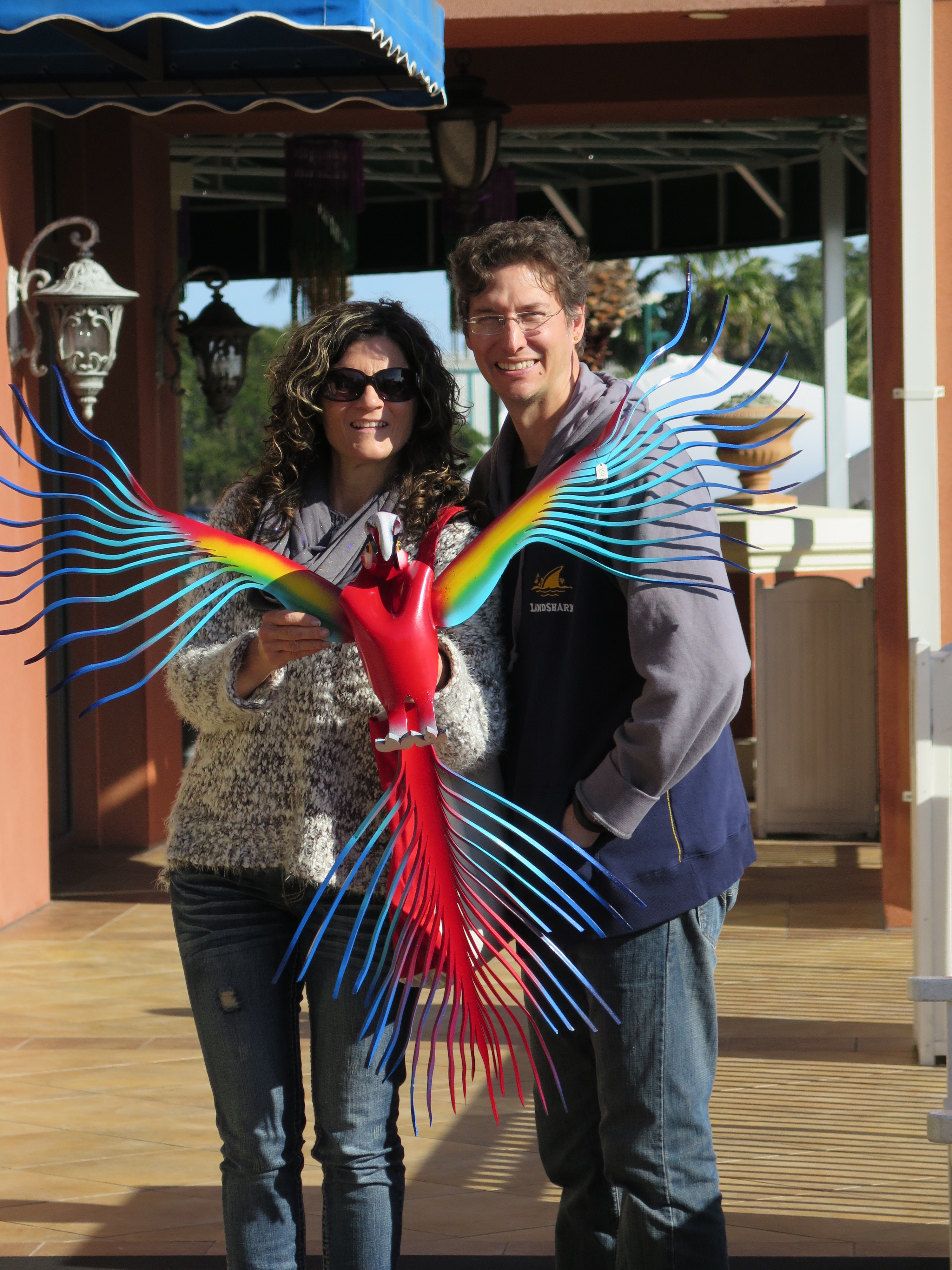 Joan and Steve show off their parrot from Special Touch Gallery.