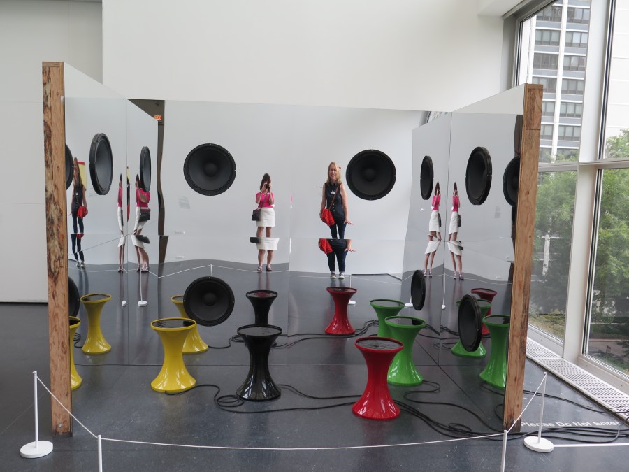 Kathleen and Mary S reflected in “La Grande Oreille,” mirrors, speakers, sound system and wood structure