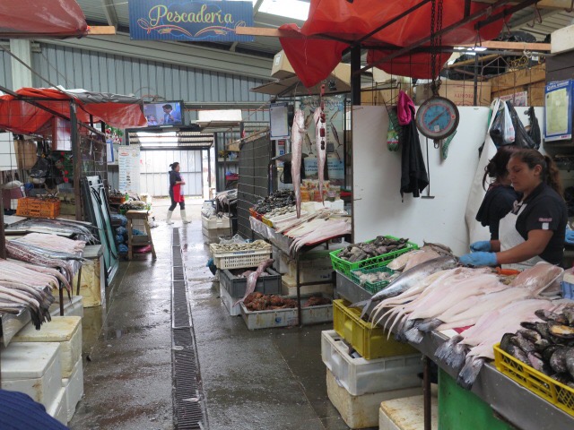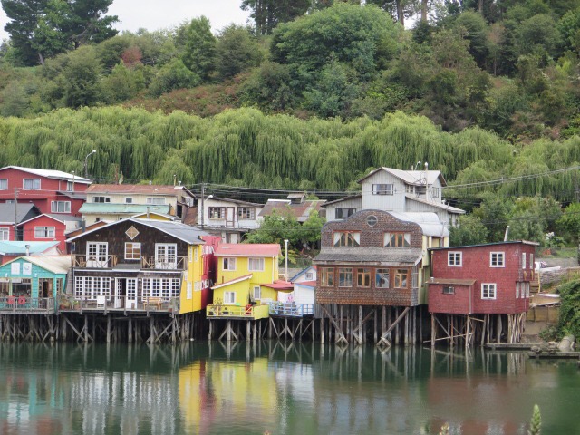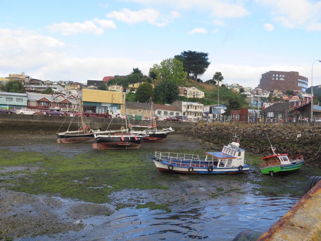 Our ship pulled in this morning at low tide, outside of Castro, a city on Chiloé Island, and the capital of Chiloé province. We could see several boats sitting on land. By late evening, at high tide, those same boats were floating. The water level changes by about 10 feet from low to high tide. It looked like the tide was going out again around 5pm. People who live along the water build their houses on stilts. Because the land is often covered by water, the residents cannot own the land, they can only own their houses.