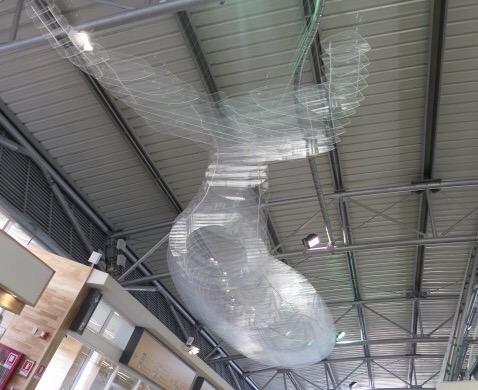 On our way to the airport, our guide informed us that we would not know for sure that we’d take off until after we got to the airport. Even then, we had to wait while the pilots conferred with meteorologists about the forecast. Another group was scheduled to go yesterday, but couldn’t because of fog. The pilot can’t land if he/she can’t see the runway. We got our boarding passes which we hoped was a good sign. We knew that the latest the flight would leave was 10am, so we waited around in our hot gear, checked out the two tourist shops, and admired the hanging sculptures of whales.