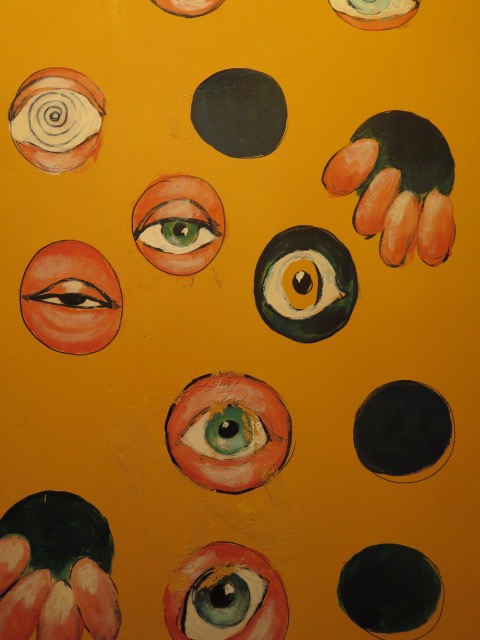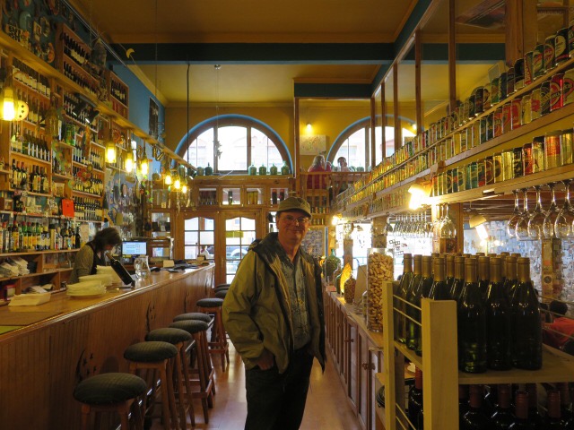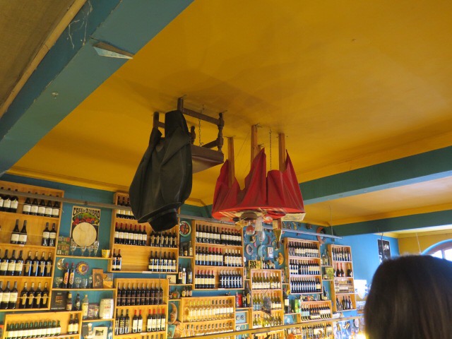 We had lunch at La Luna Cafe, a couple of blocks from the center of town. What a delightful find! Not only was the food and service good, the restaurant was eclectically decorated, including a set table suspended upside down from the ceiling, stickers and posters on the walls, a large collection of beer cans and chandeliers made of pots and pans, flatware, wine glasses, etc. But the best was the art in the restrooms.