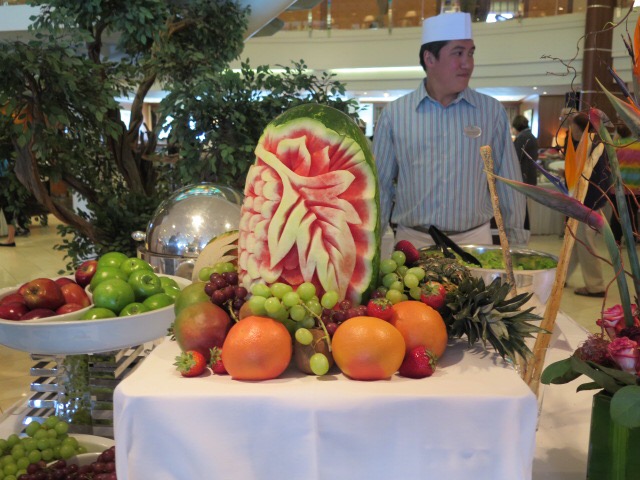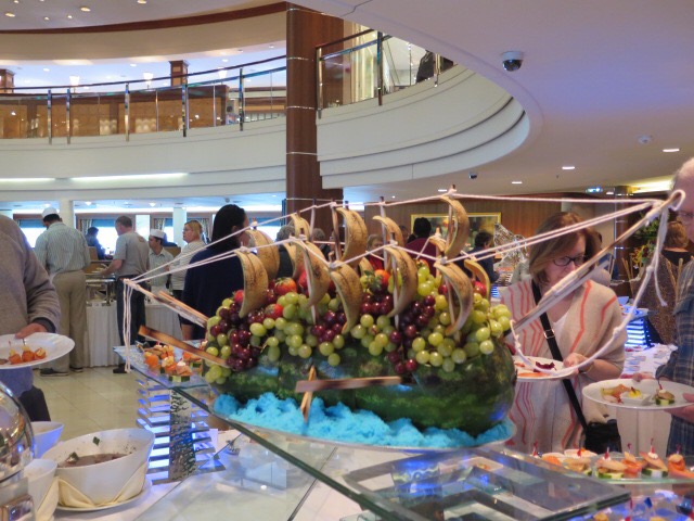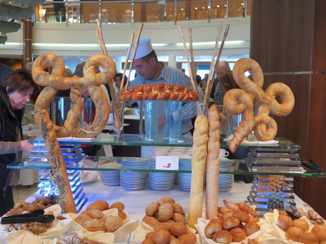 At noon, there was a brunch in the atrium, accompanied by some light jazz. The music was lovely, the food presentation almost as much, and the food itself was, as always, very good. I keep saying that I’m going to cut back, but then I see something I can’t resist – like macaroons.