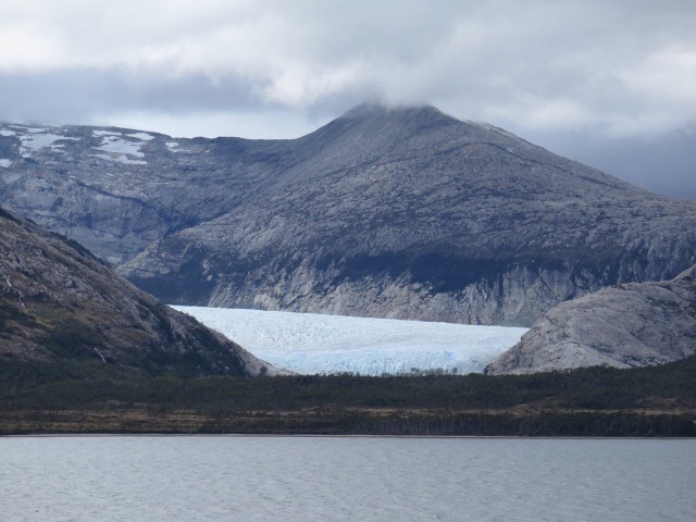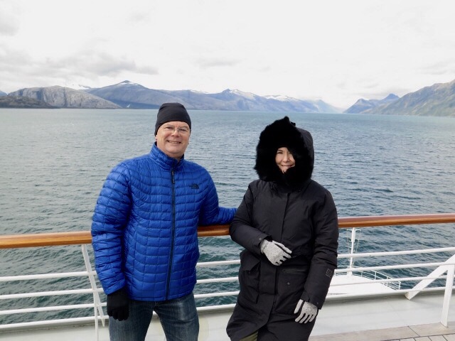 When we ventured out this afternoon to see the numerous glaciers and waterfalls that we’ve been sailing by, we were nearly blown off deck. I finally got to use my down jacket and other cold weather gear. The water in these channels is almost turquoise in color – very beautiful. The glaciers that we saw today do not flow to the water, so we didn’t get to see any calving. I really have no complaints, though.