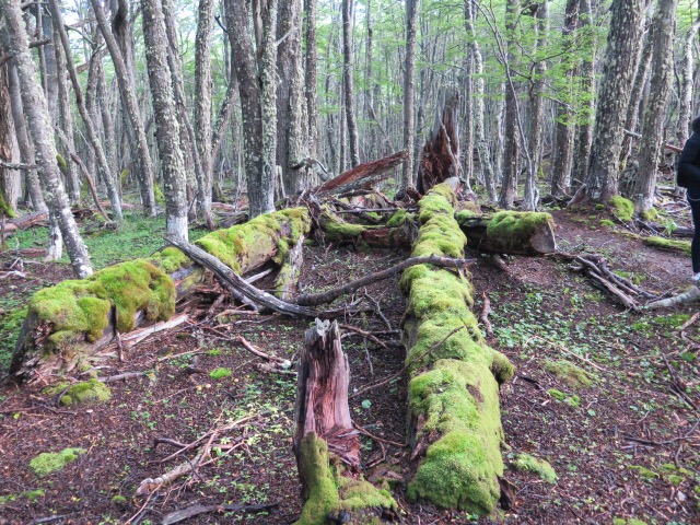 We then hiked along an old woodcutter’s trail into the Fuegian forest. Here again, there are the three types of native trees, one evergreen and two deciduous. They are all related. Of the two deciduous, the lenga beech is used for furniture and construction as it grows quite tall and straight. The other deciduous is a low growing version. We saw quite a few downed trees. Geographically, this is fairly new land and the soil is not very deep. A shallow root system makes these trees vulnerable to the strong winds that blow through Tierra del Fuego.