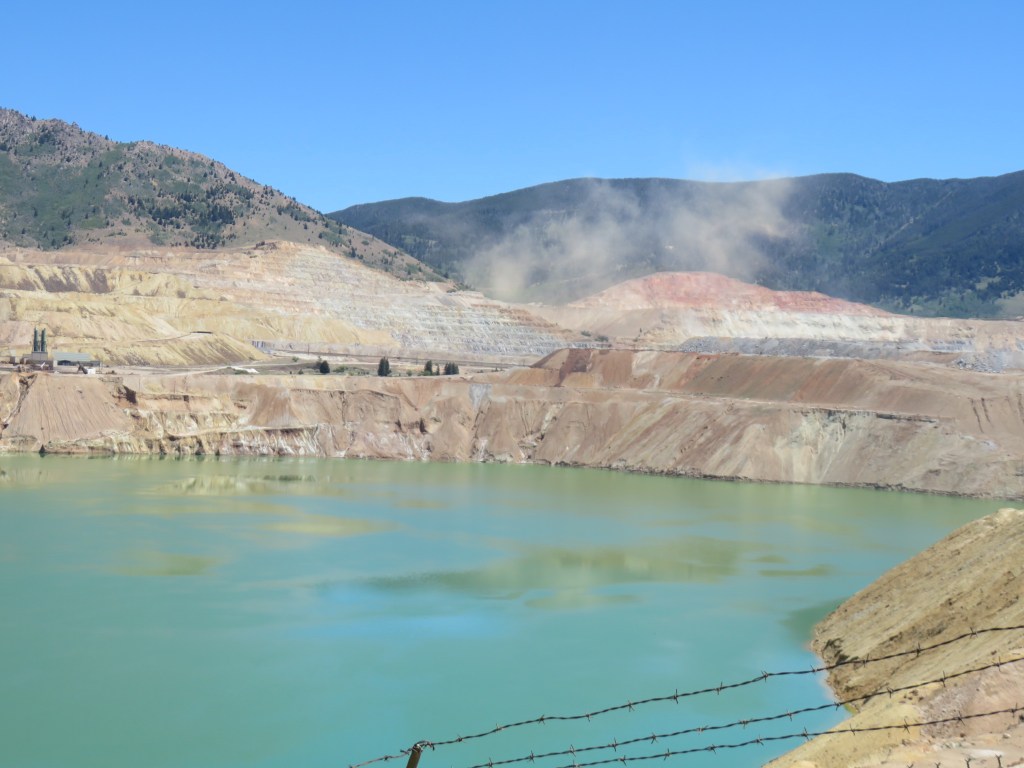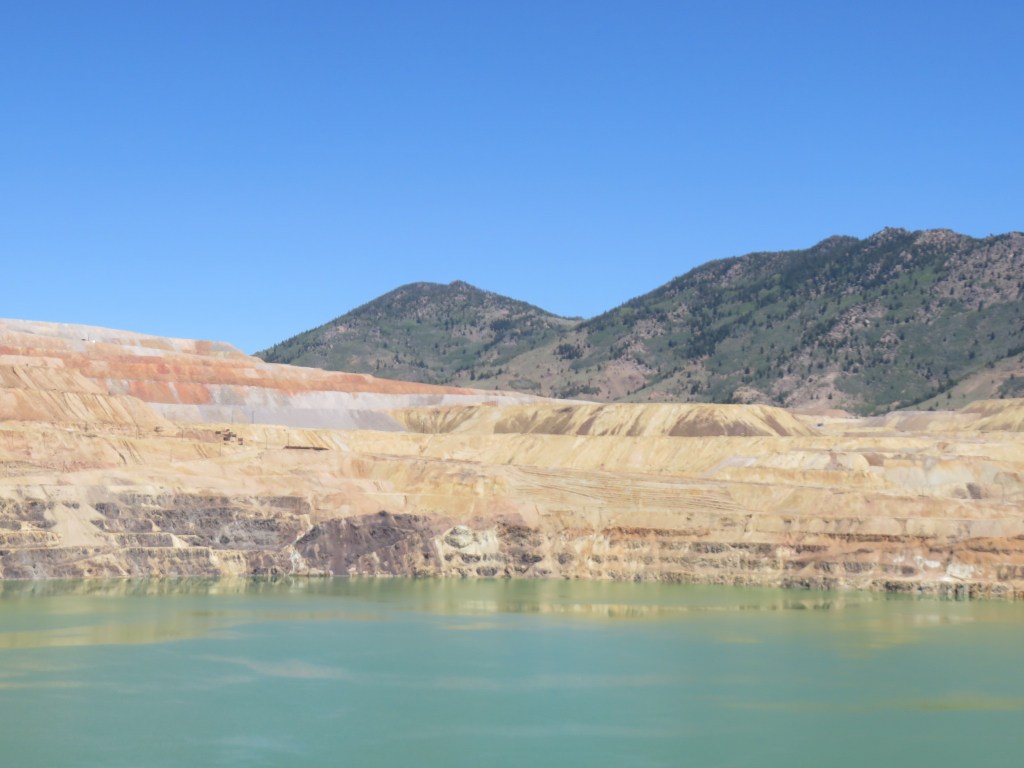We next stopped at the Berkeley Pit, which was mined for copper from 1955 to 1982. The pit is about 1800 feet deep, over one mile long and nearly a mile wide. Several neighborhoods were removed to allow for the mining operations. The owners were compensated at market value for their homes, then given the option to buy them back for $1 and move them elsewhere. Homes not repurchased were demolished. About one billion tons of material were removed: copper, silver and gold, which gave Butte its nickname “The Richest Hill on Earth.”