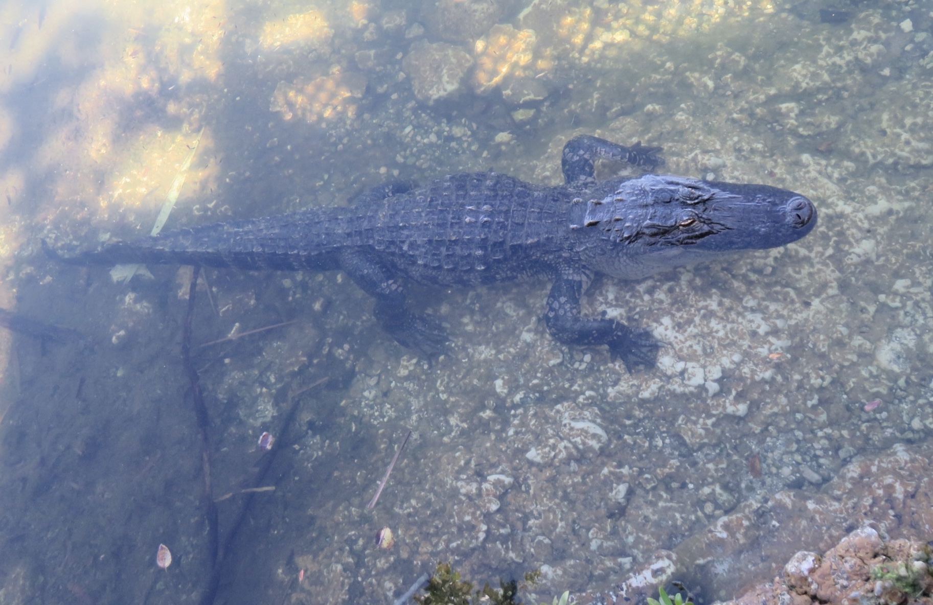 We walked several paths in the refuge, but had no luck spotting any deer. In hot weather, they prefer to stay in the shade, and venture out in the evening. We walked to the Blue Hole, which is an abandoned limestone quarry. There is plenty of evidence that the deer do come here to drink. Although there were no deer in sight, we did spot an alligator, some birds and butterflies.