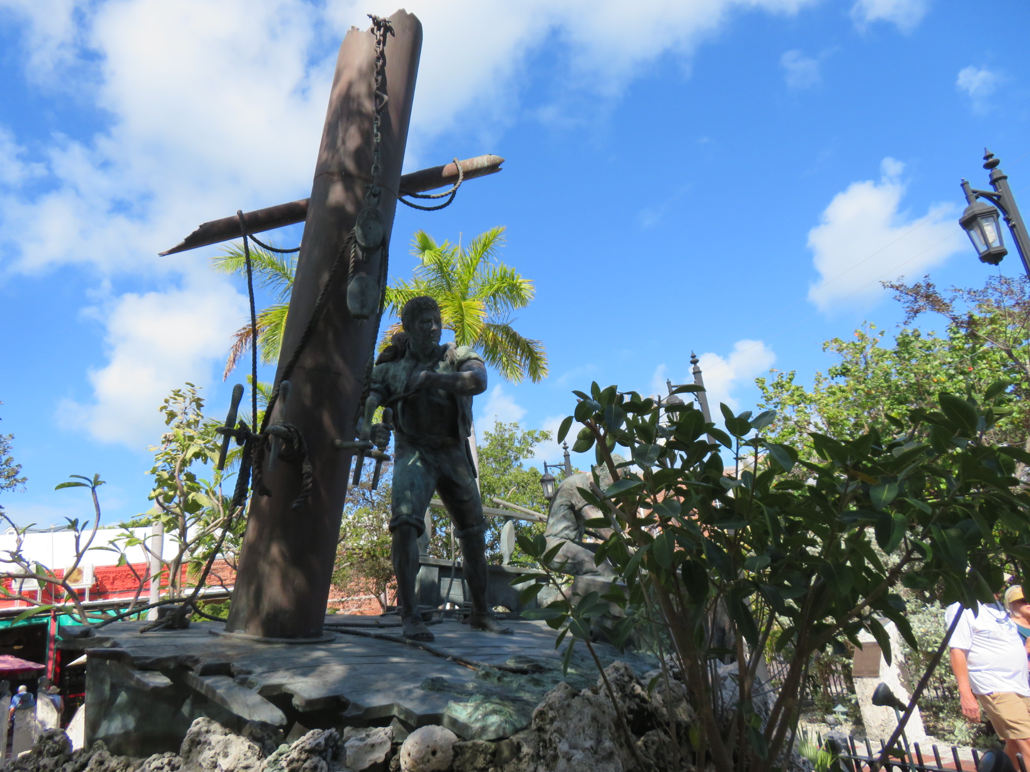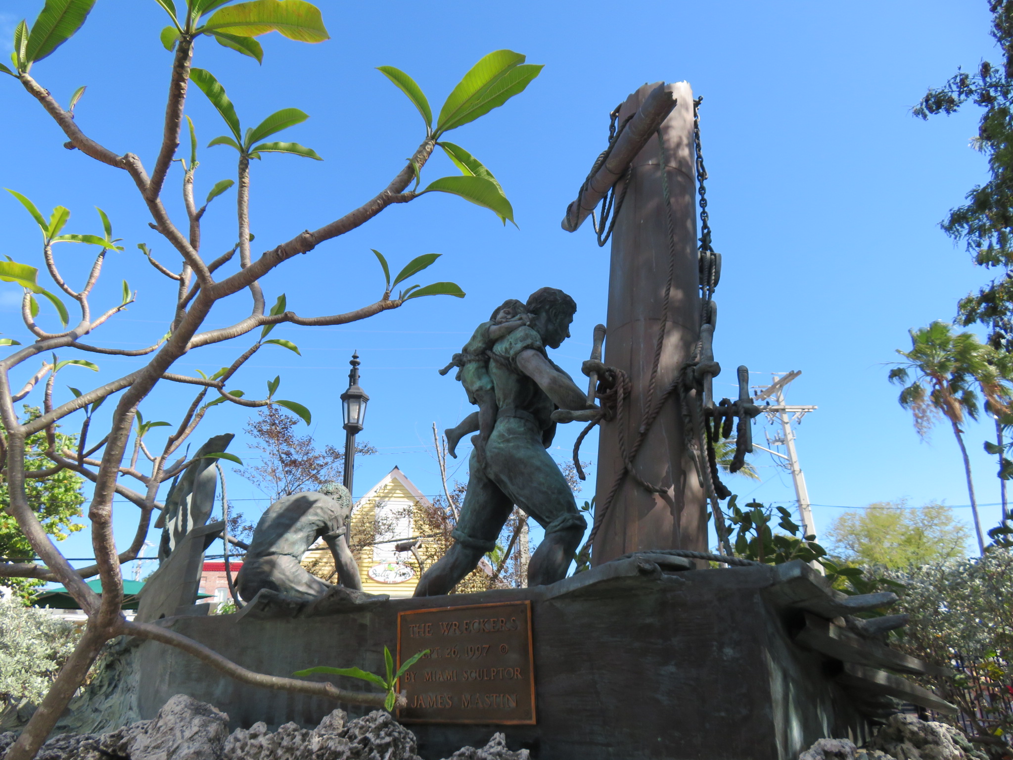 The sculpture garden has busts of many of the people who played roles in Key West history, with the largest sculpture being “The Wreckers,” by James Mastin of Miami. This sculpture features “wreckers” salvaging cargo and saving lives from a shipwreck on the reef. At one time, Key West residents were among the richest in the country, with their fortunes coming from salvage. Many ships ran aground on the reef that runs along the coastline. The first person to reach the wreck was named the ”wreck master,” and he would organize other salvagers to do the work. The salvaged cargo was auctioned off on shore, and a judge determined how the proceeds were distributed. The wreck master usually receive 25 percent. ”Wrecking” was a very lucrative business for the residents of Key West until ship captains learned how to avoid the reef.