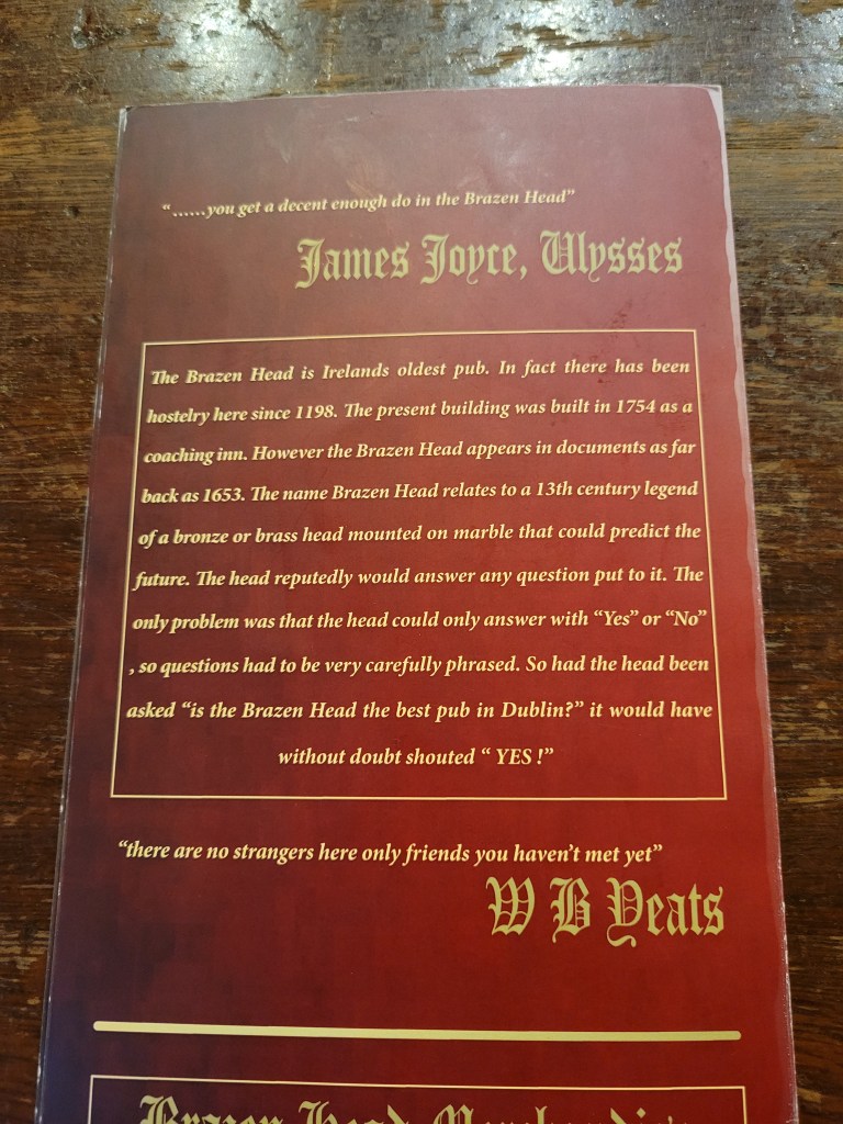 After returning to Dublin, we had dinner at The Brazen Head, which bills itself as Dublin’s Oldest Pub, dating back to 1198 AD. While there was a pub or inn at this location since then, the name of The Brazen Head doesn’t appear in documents until 1653. The current structure was built in 1754. The place was very busy, we had to be quick to spy an open table before someone else grabbed it. This is not the traditional Irish pub, rather one that caters to the tourist trade. Still, we were hungry and the food was fine.