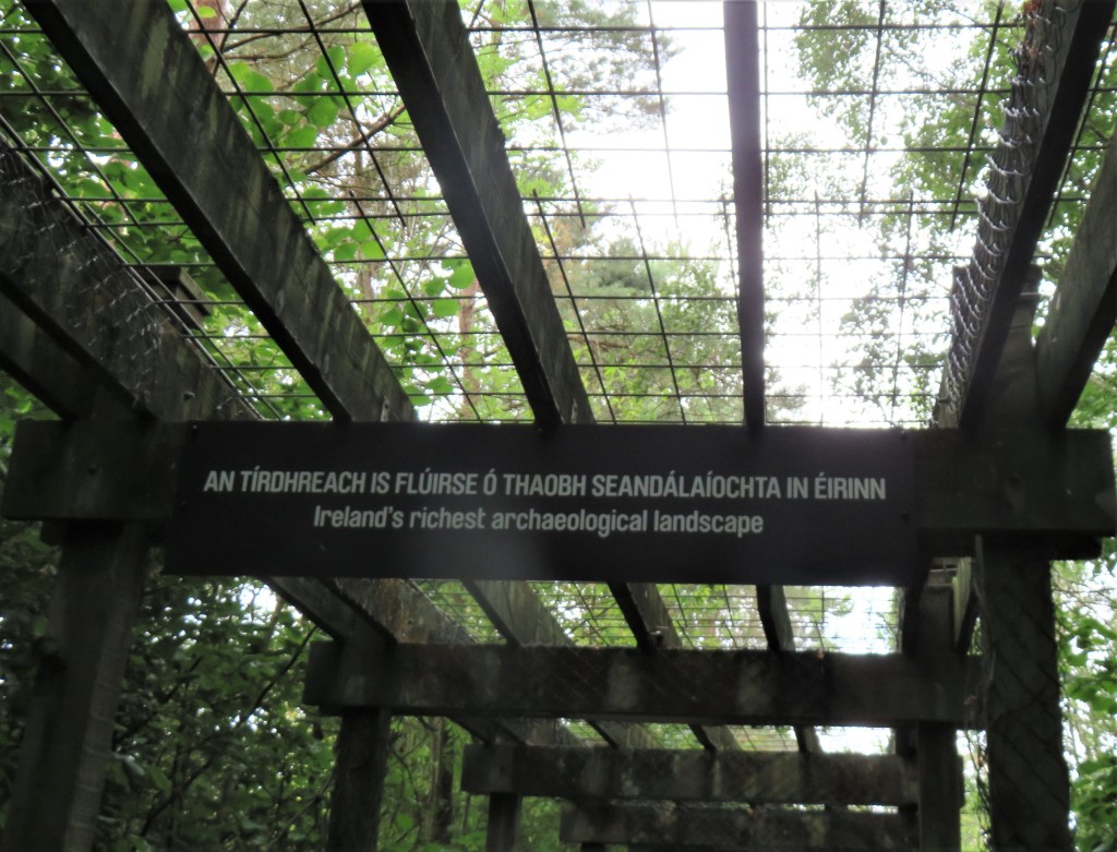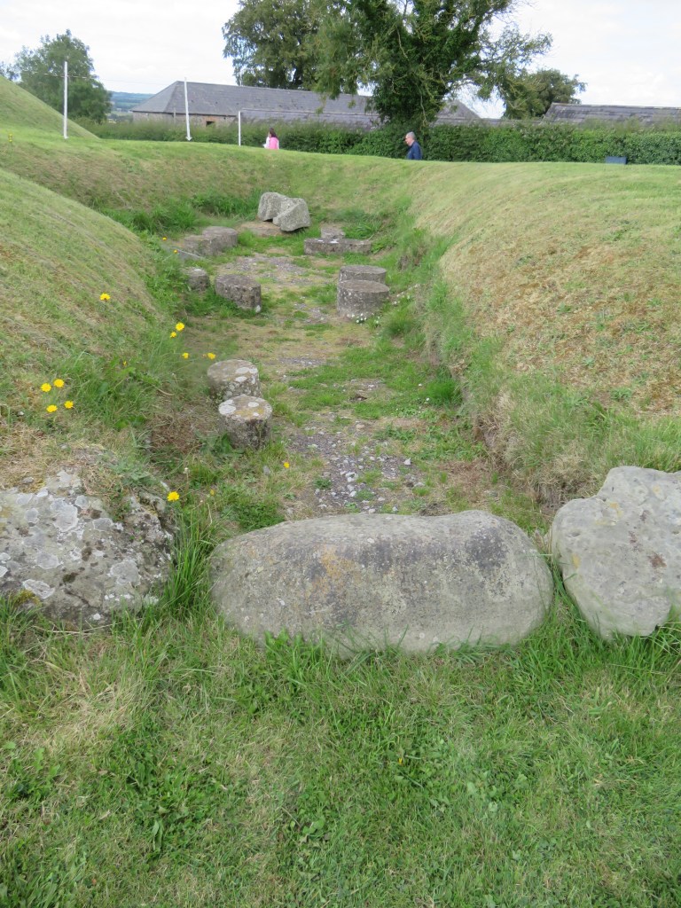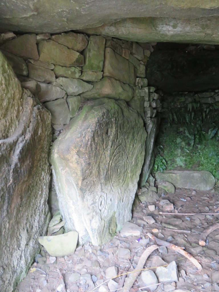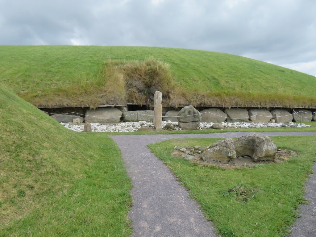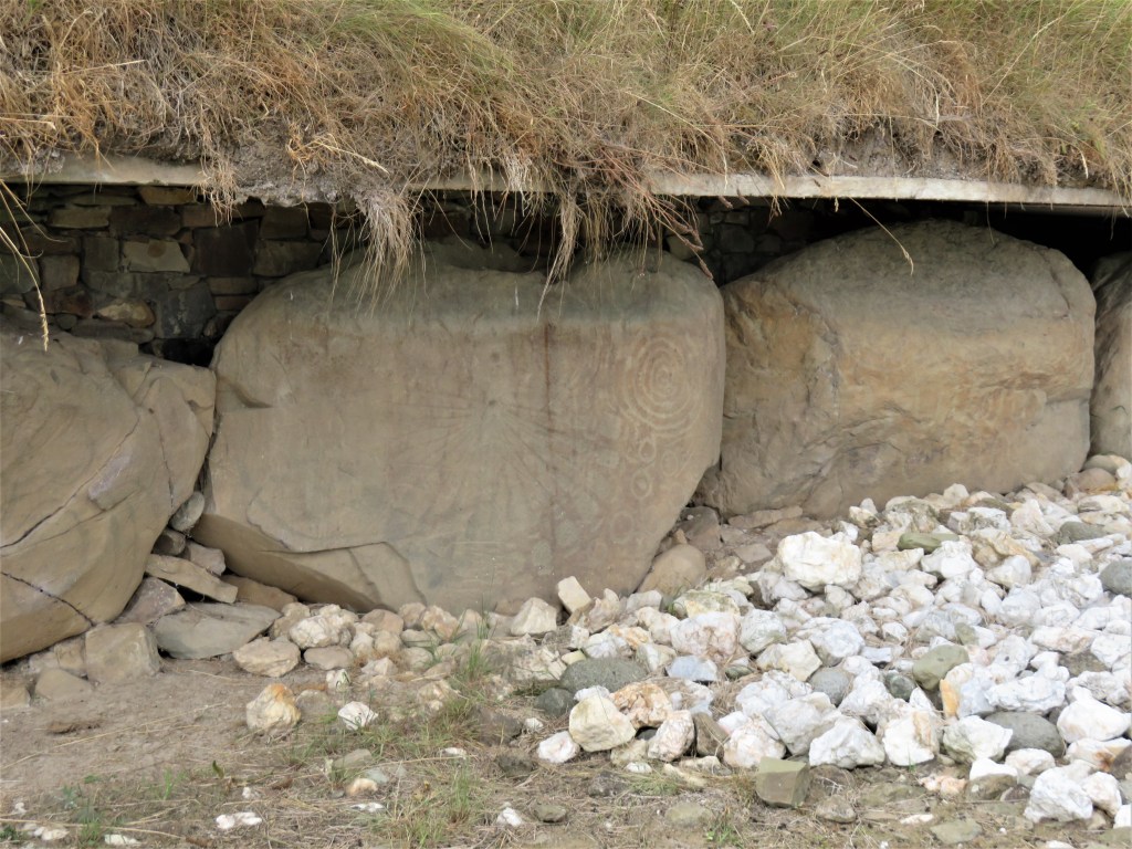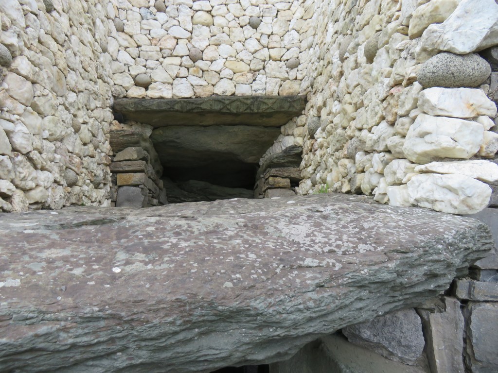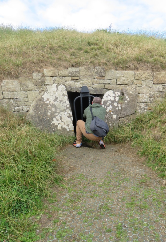 The Mound of Hostages, built around 2500 BCE, is one of the oldest structures that were built here. This is a passage tomb, and, like other passage tombs, it is aligned to the sun on the Celtic festivals of Samhain and Imbolc. We could not enter the passageway at the Mound of the Hostages, but we could, and did peek through the grate that protects the entrance. The decorated stone on the left of the entrance is called an orthstat (an upright stone or slab set in the ground or as part of a structure.)