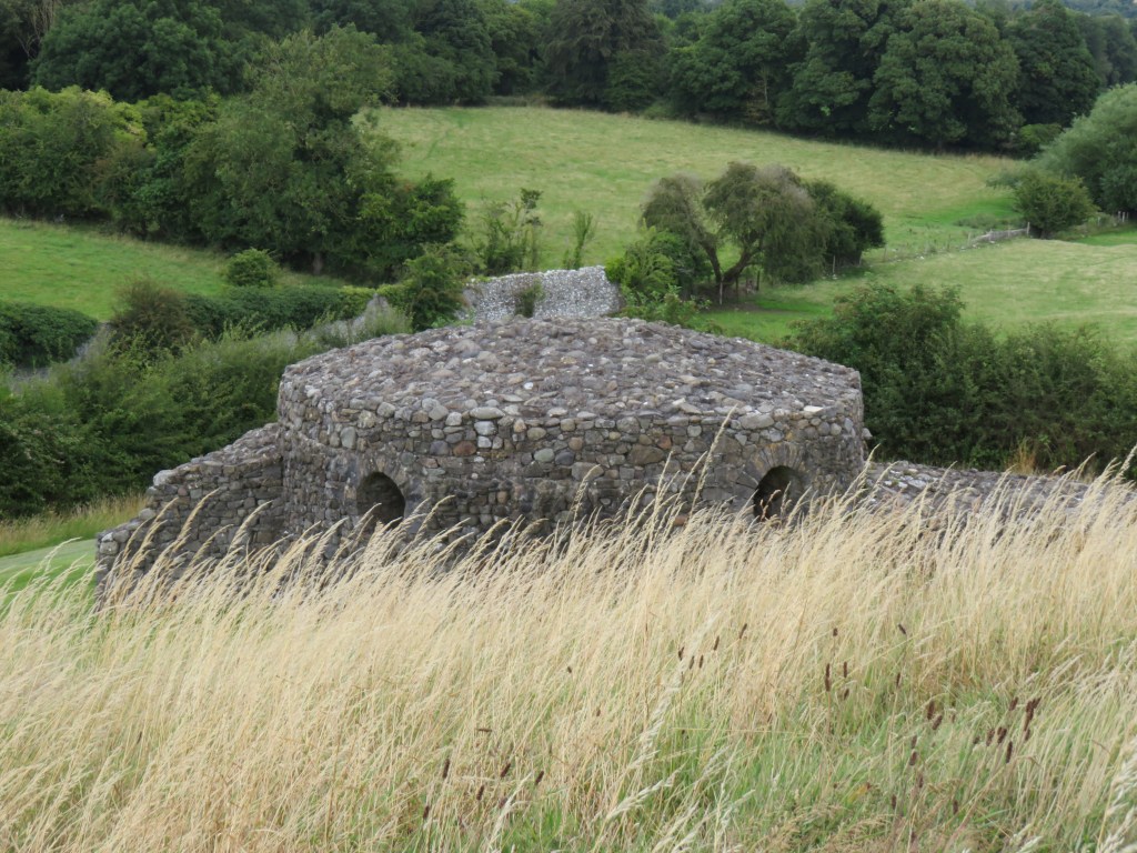 The Brú na Bóinne Visitor Centre, a short walk from Newgrange, holds a great deal of information about the heritage sites in the Boyne Valley. Newgrange is about 5,200 years old, older than Stonehenge or the Great Pyramids. This passage tomb/ancient temple measures 279 feet in diameter and 43 fee in height. Like the Mound of Hostages, Newgrange is surrounded by kerbstones, but only a few contain any artwork. At the winter solstice, the sun shines, at dawn, through a roof-box above the entrance, illuminating the entire chamber. A guide took us into the passageway, and, using artificial light, demonstrated the winter solstice illumination.