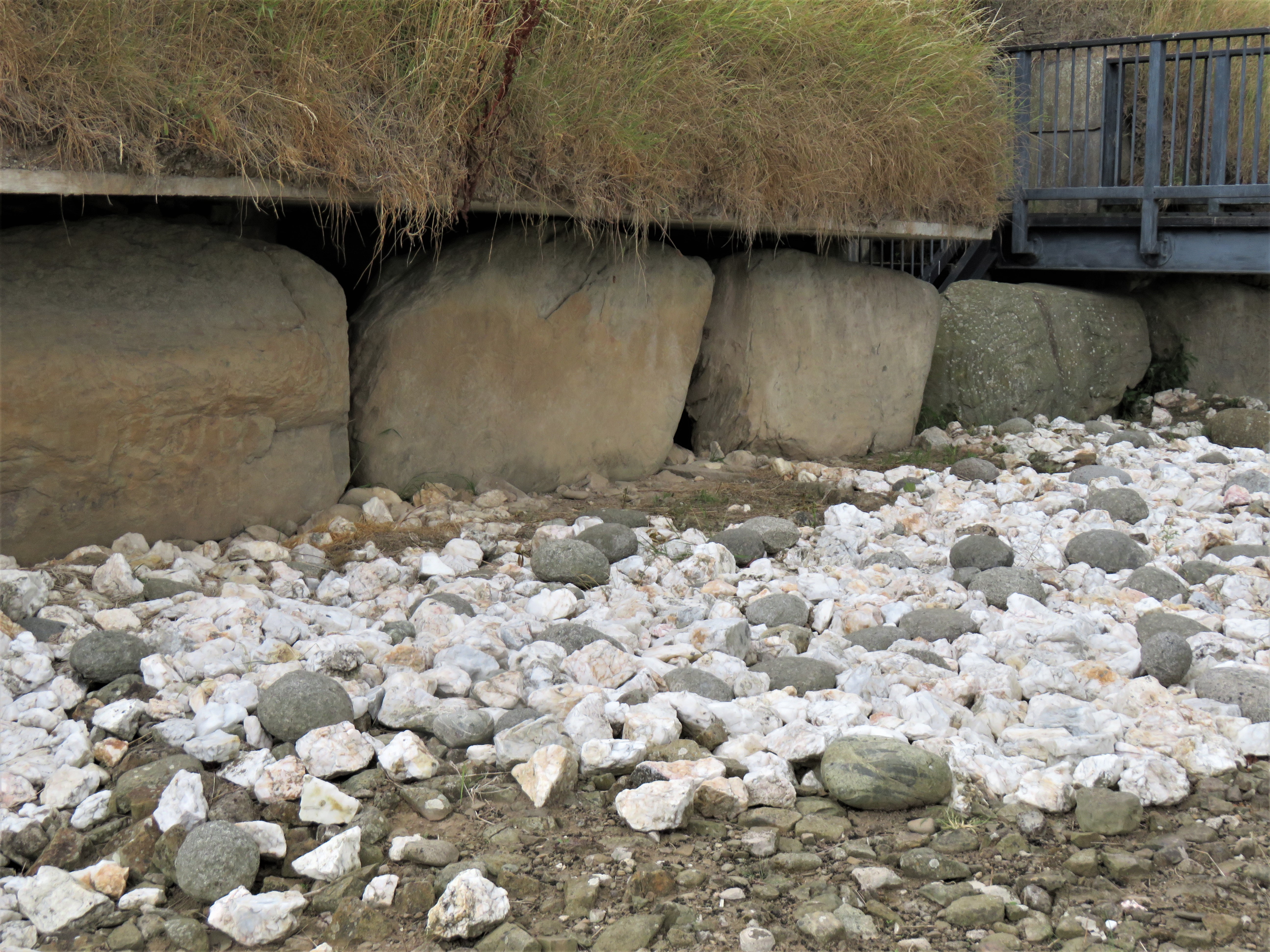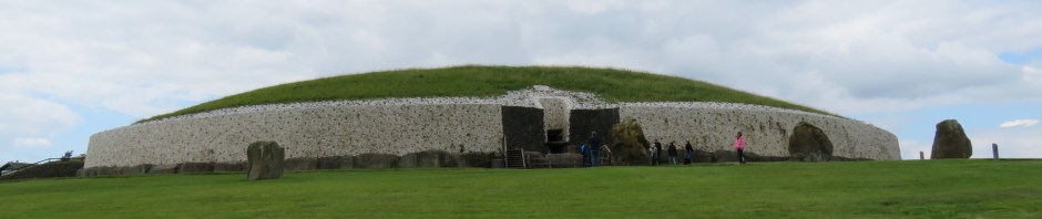 The Mound of Hostages, built around 2500 BCE, is one of the oldest structures that were built here. This is a passage tomb, and, like other passage tombs, it is aligned to the sun on the Celtic festivals of Samhain and Imbolc. We could not enter the passageway at the Mound of the Hostages, but we could, and did peek through the grate that protects the entrance. The decorated stone on the left of the entrance is called an orthstat (an upright stone or slab set in the ground or as part of a structure.)