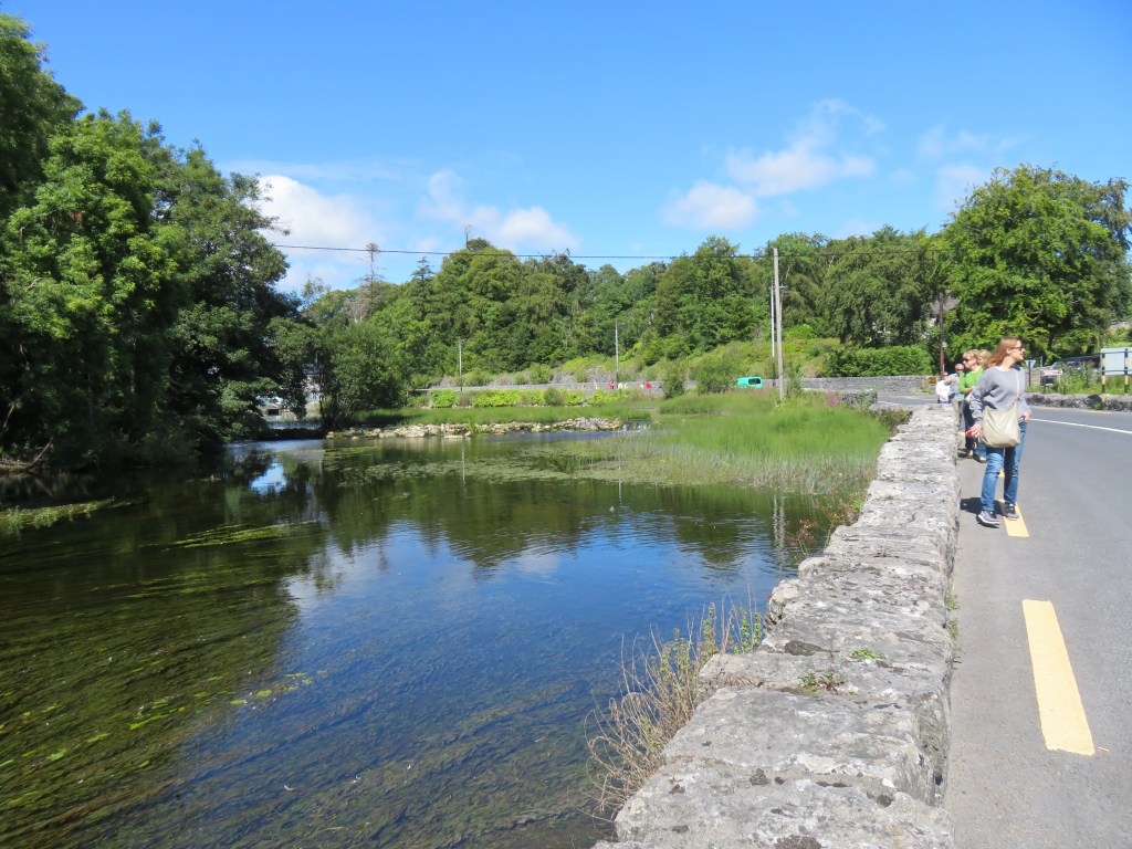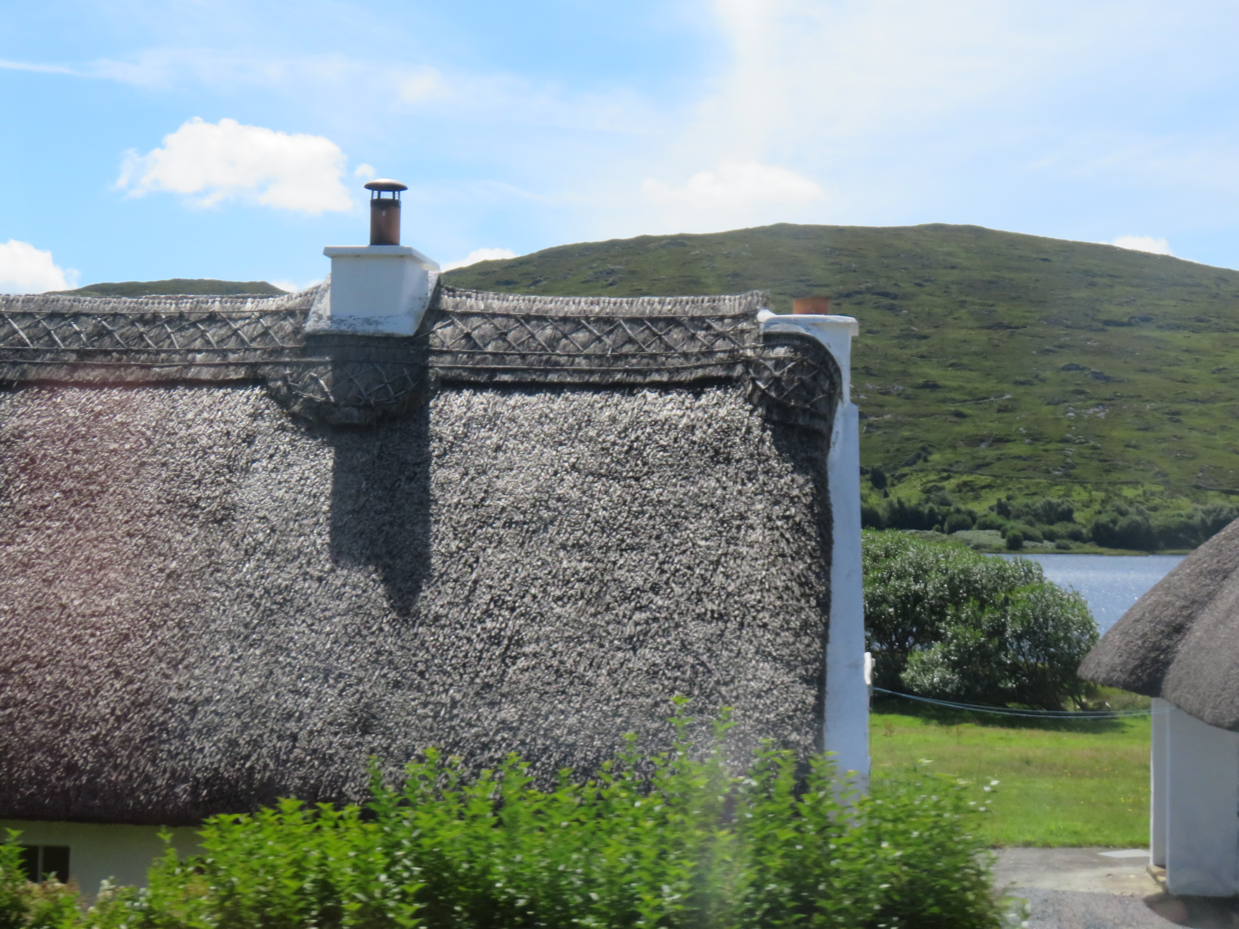 We drove through beautiful country on our way to Galway, viewing lakes and farms as we sped past. We saw several buildings with thatch roofs. Thatch is a natural reed and grass which, when properly cut, dried, and installed, forms a waterproof roof that can last as long as 60 years. It is considered an art form, and each artist uses a distinct finishing pattern at the top.