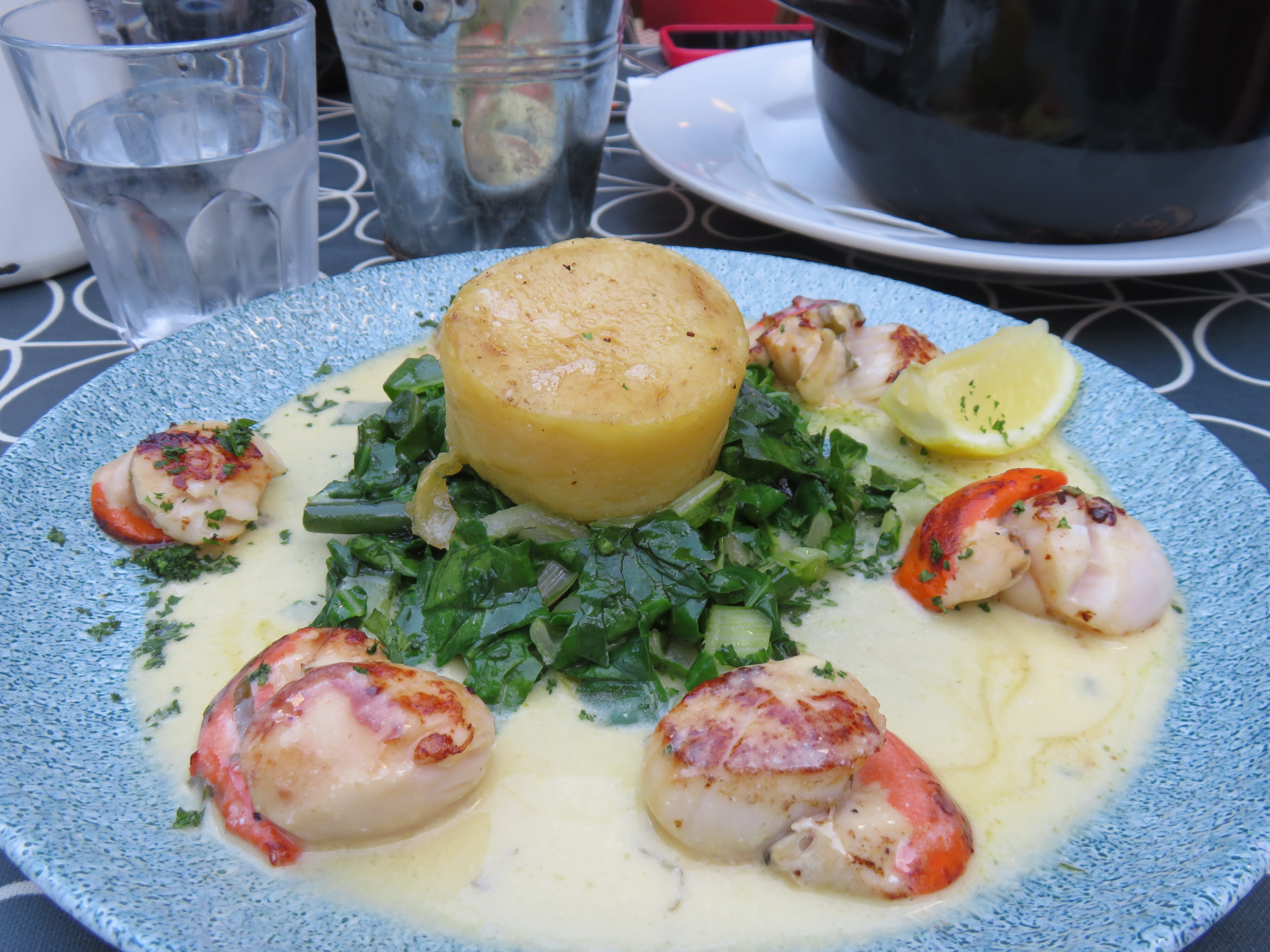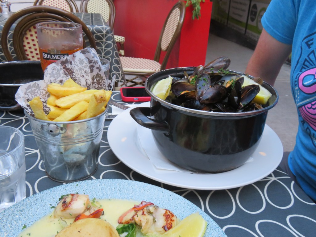 Downtown Galway is full of shops and pubs, all designed to attract tourists and their money. I was no exception. Sean and I met at Taaffes Bar, recommended by Cash, where I tried some Irish cider. It’s not like the “hard” cider we have in the US. This cider is less sweet, more refreshing. Taaffes was very busy, we were lucky to get a table outside. People were gathering for the live music on tap for later. It didn’t look like we’d get an inside table for food, so we moved on. We had an excellent meal at the King’s Head Bistro. Since we are so close to the ocean, seafood was a must. While I enjoyed the scallops, Sean had mussels, a lot of mussels, at least 60! He almost ate them all.