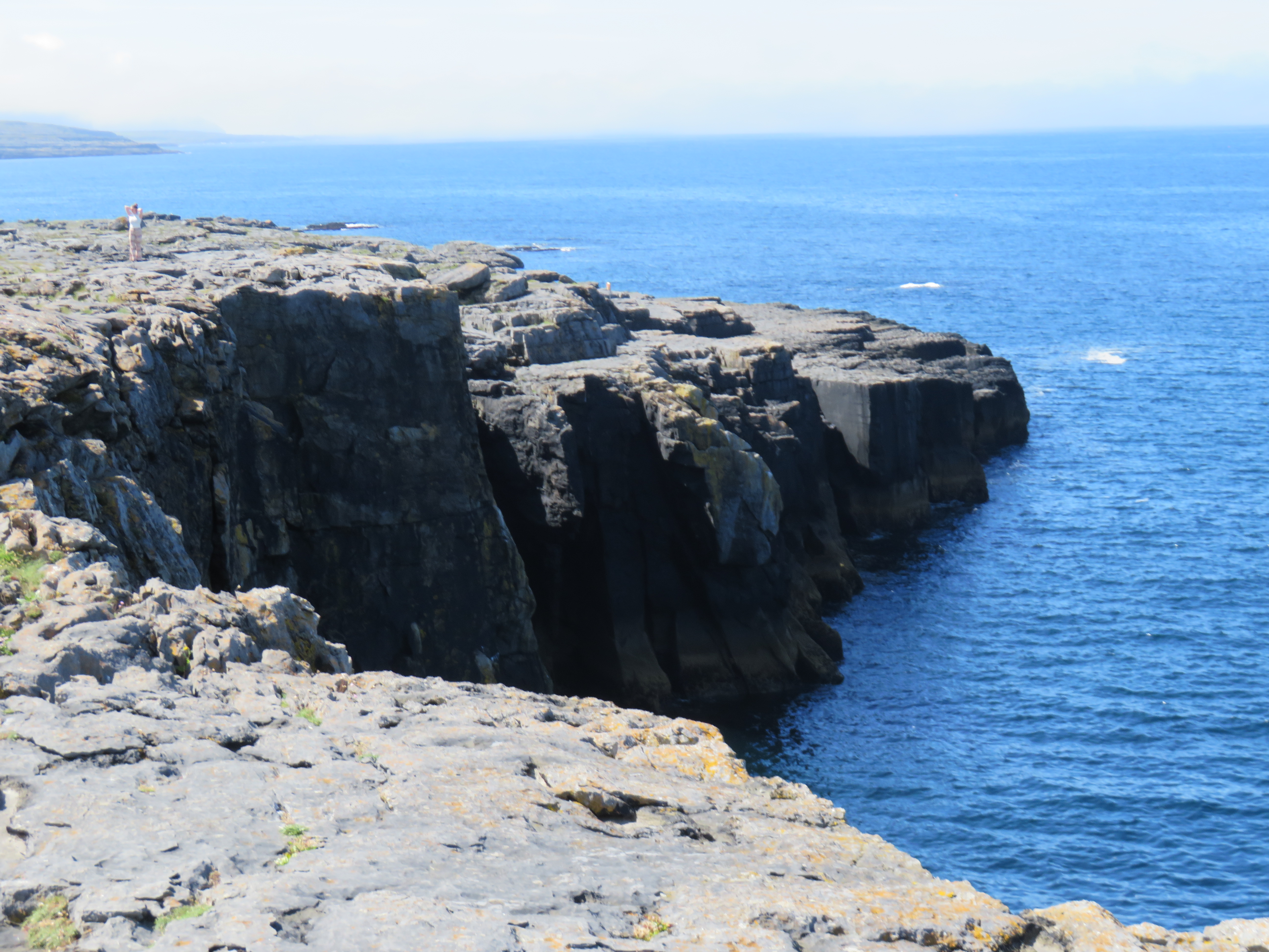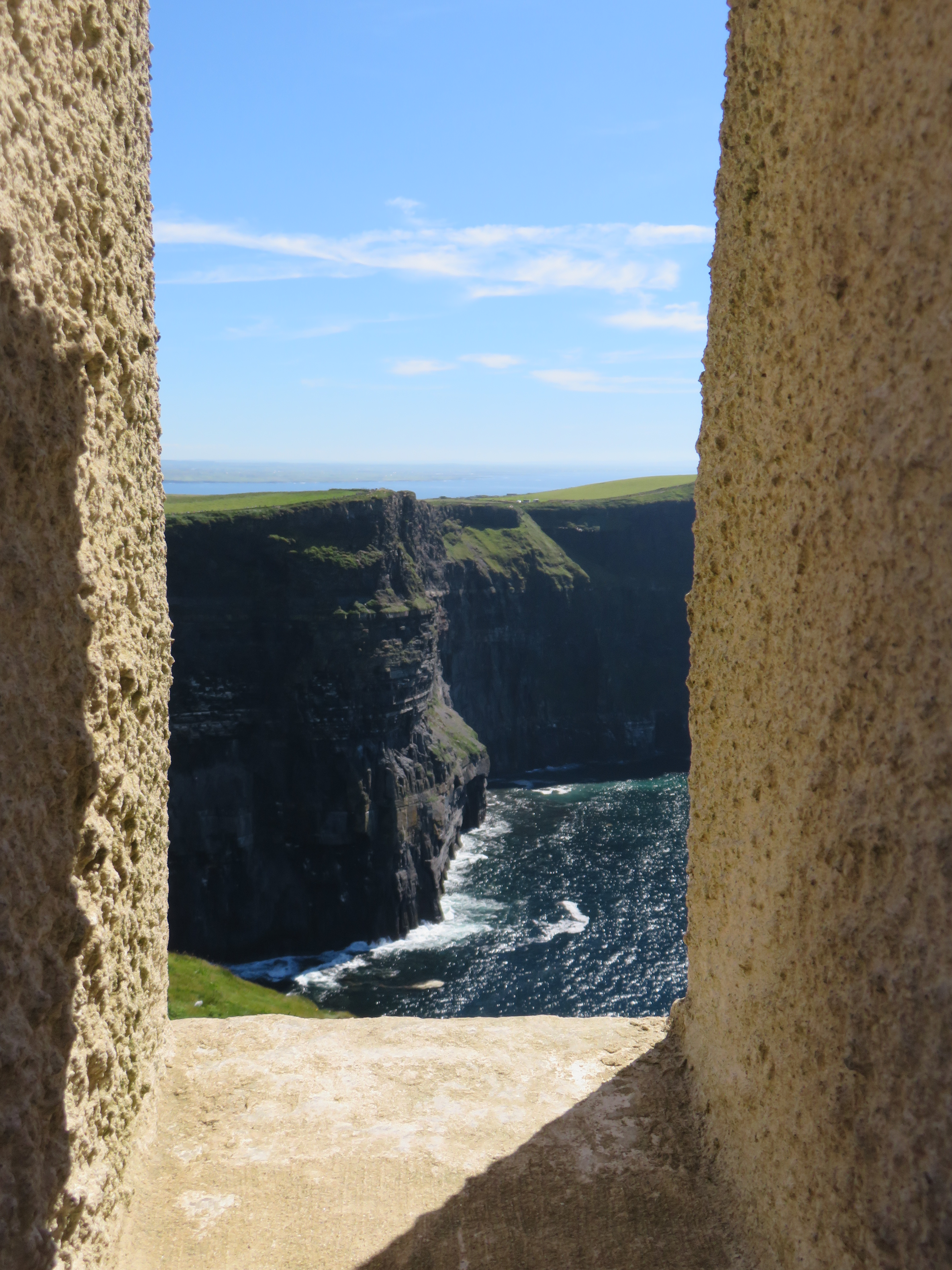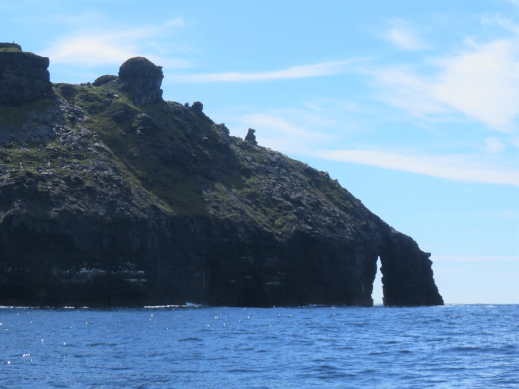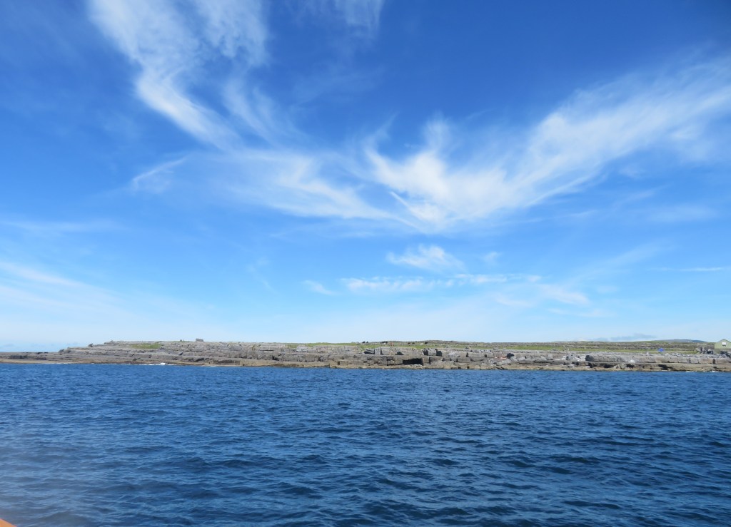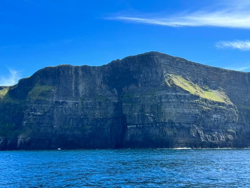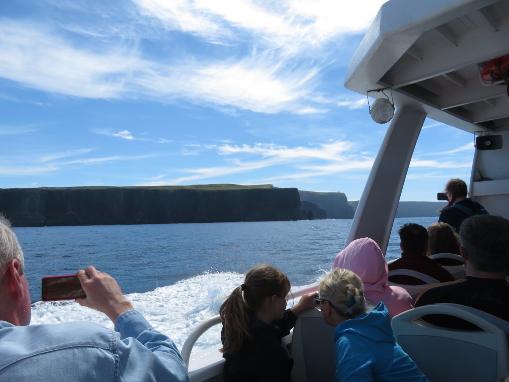 After an ice cream break in Doolin, where Cash warned us not to look into the owner’s eyes or we’d fall in love (he was a nice looking young man), we continued on to the Cliffs of Moher. We had opted for a boat ride below the cliffs. This wasn’t a leisurely ride, we sped past the towering cliffs (up to 700 feet in height), with passengers crowding the open areas to get their photos. The approximately 10 mile ride took us out to Hag’s Head, with a sea arch under a signal tower. The cliffs are definitely impressive from this vantage point.