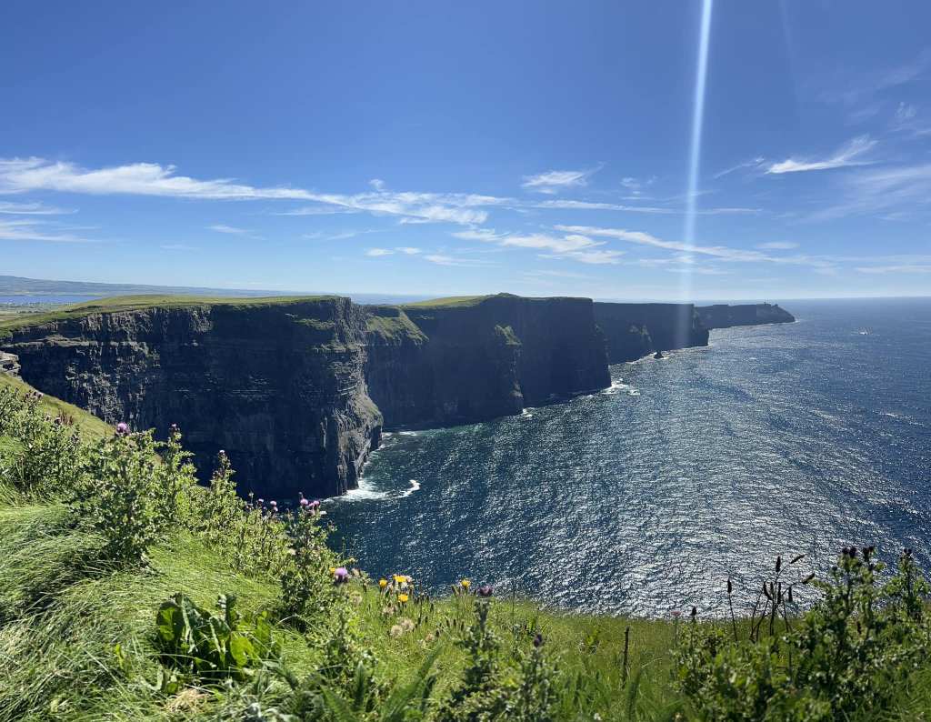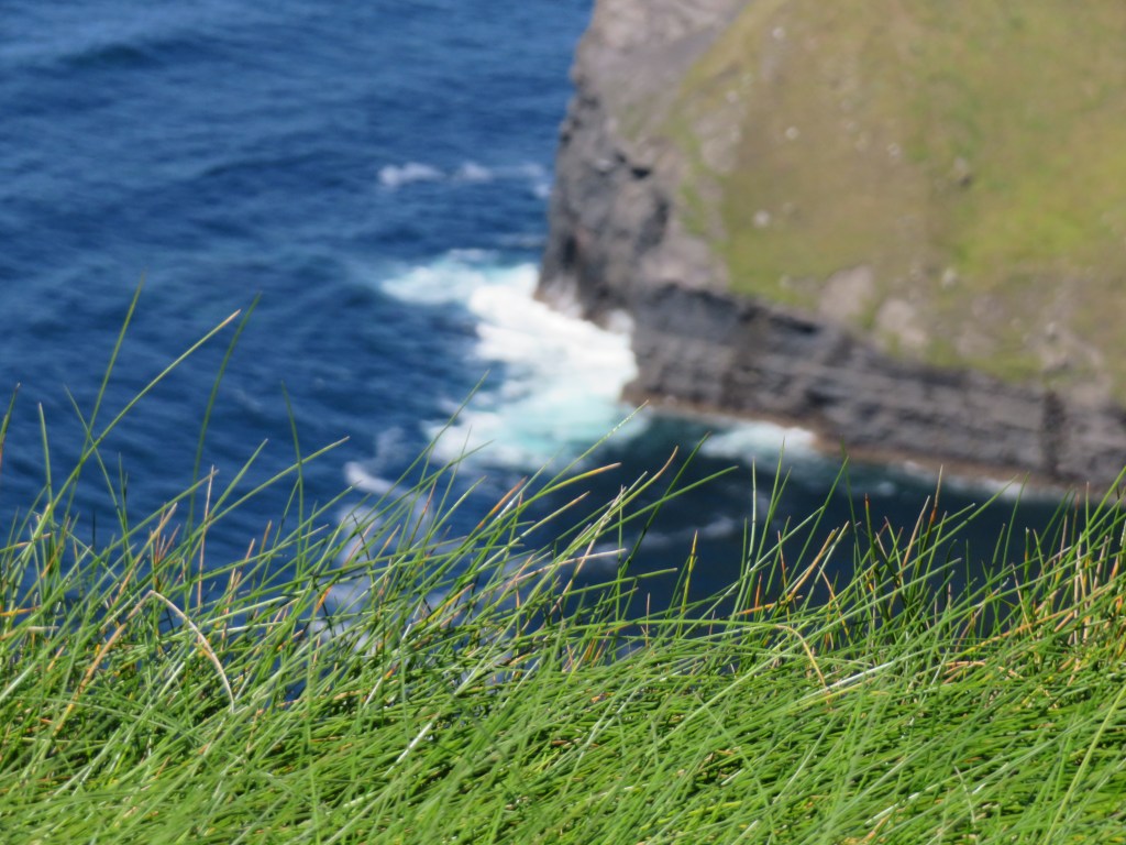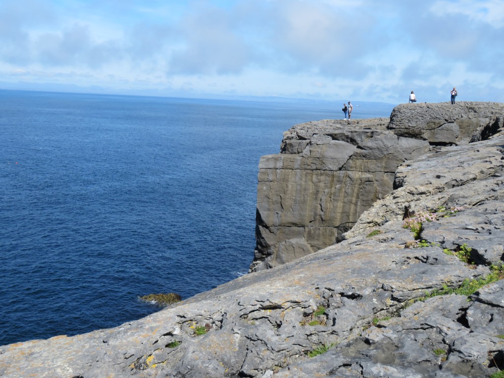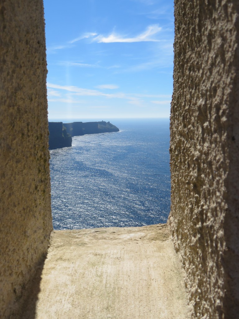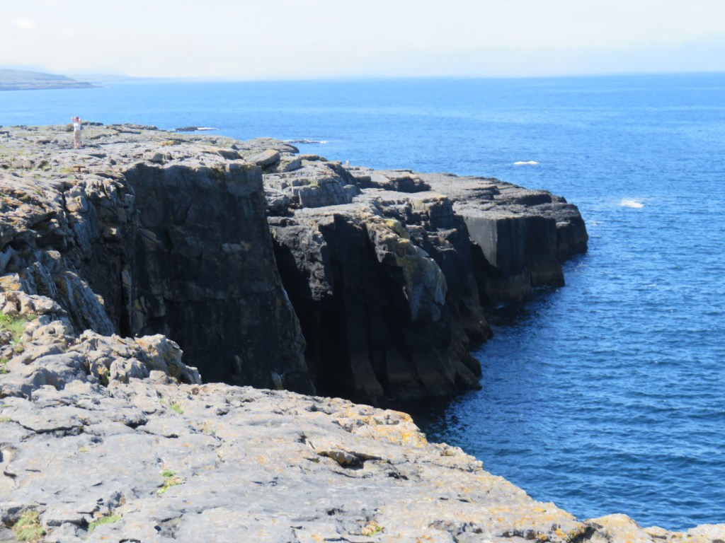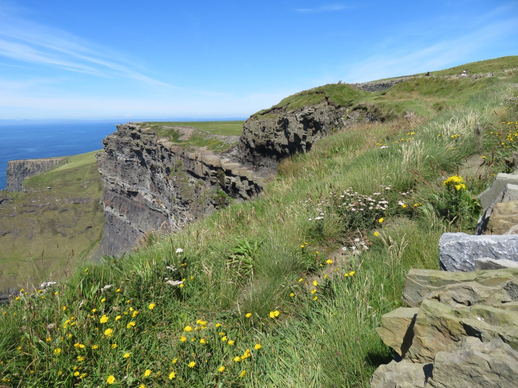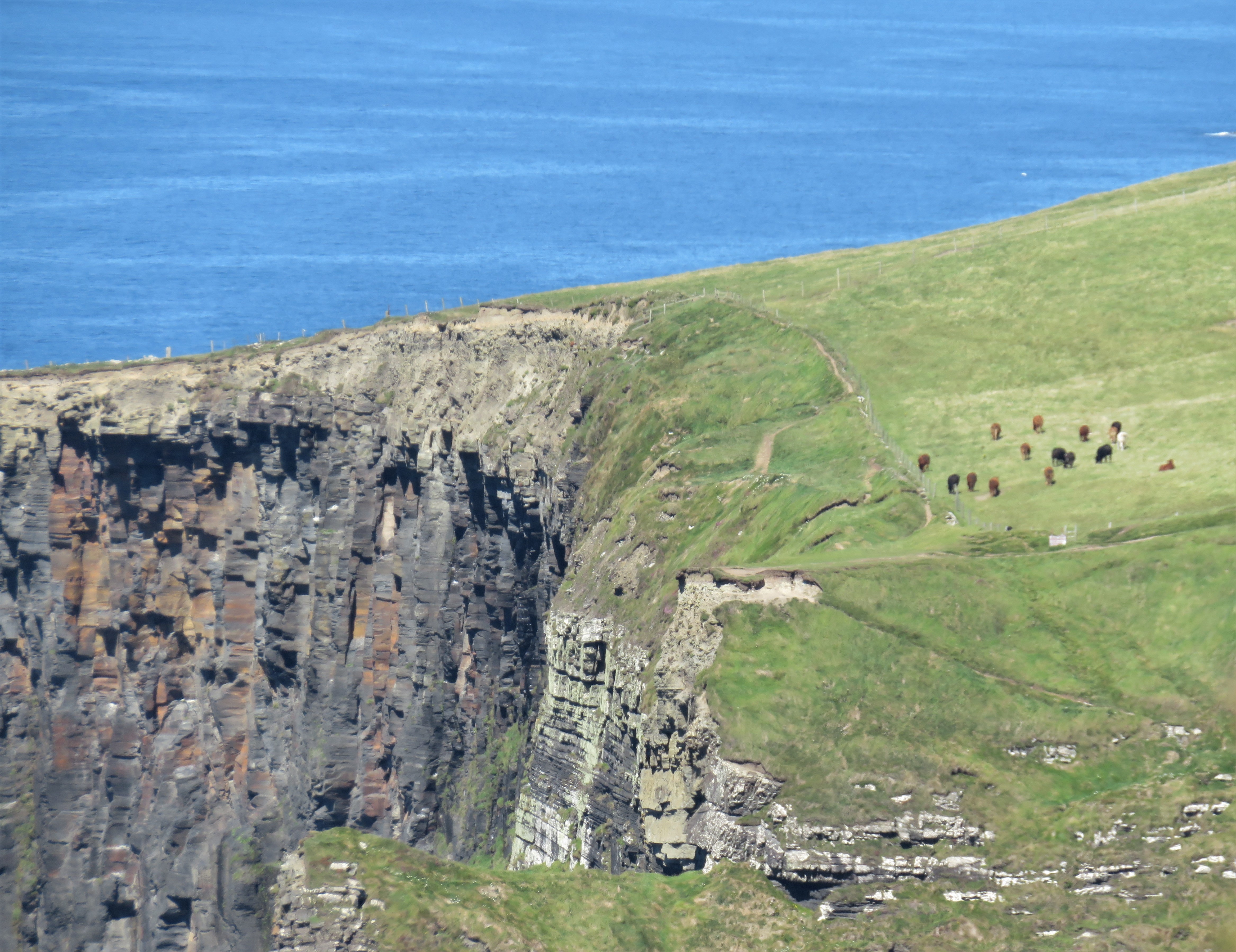 After the boat ride, we had time to walk along a short part of the Cliffs of Moher Coastal Walk, which runs about 11 miles from Doolin to Hag’s Head. The Cliffs have featured in a few movies, like “The Princess Bride” (a personal favorite) and “The Half-Blood Prince” of the Harry Potter series, as well as several music videos. The cliffs formed between 313 and 326 million years ago, from sediment dumped by an ancient river. The sediments were compacted to form the strata we can see in the cliffs. Years of erosion have created the stunning land forms, such as sea caves, sea stacks, and the sea arch seen at Hag’s Head.