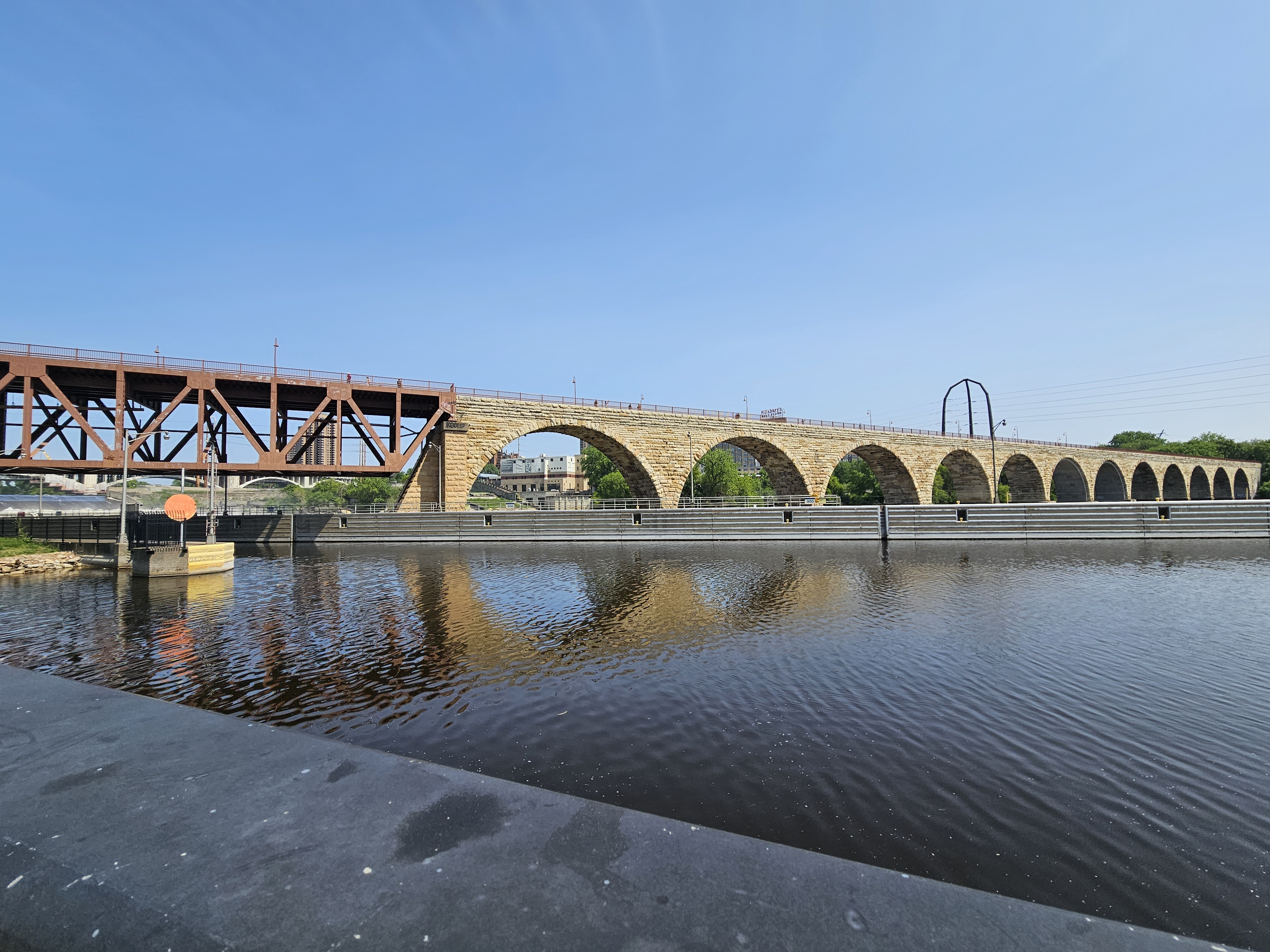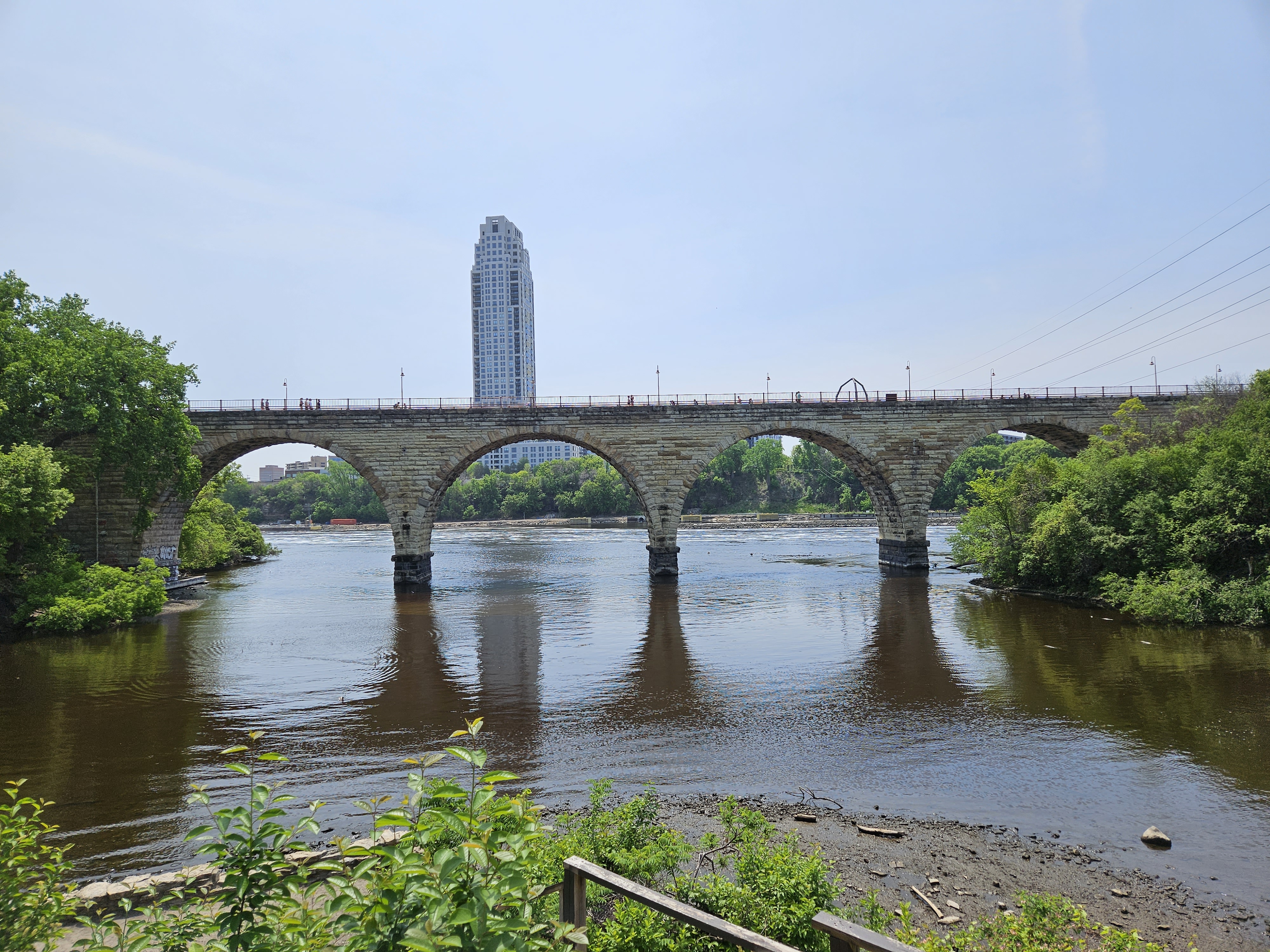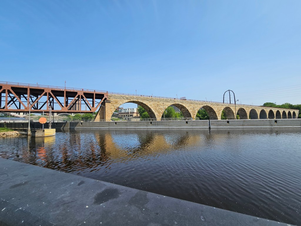 Cross the Stone Arch Bridge to St. Anthony Falls, and you quickly escape the urban landscape of downtown Minneapolis. The James J. Hill Stone Arch Bridge was built between 1881 and 1883, as a railway bridge. It served that function for almost a century, when it was converted to pedestrian use on the St. Anthony Falls Historic District. It was designated a National Historic Engineering Landmark.