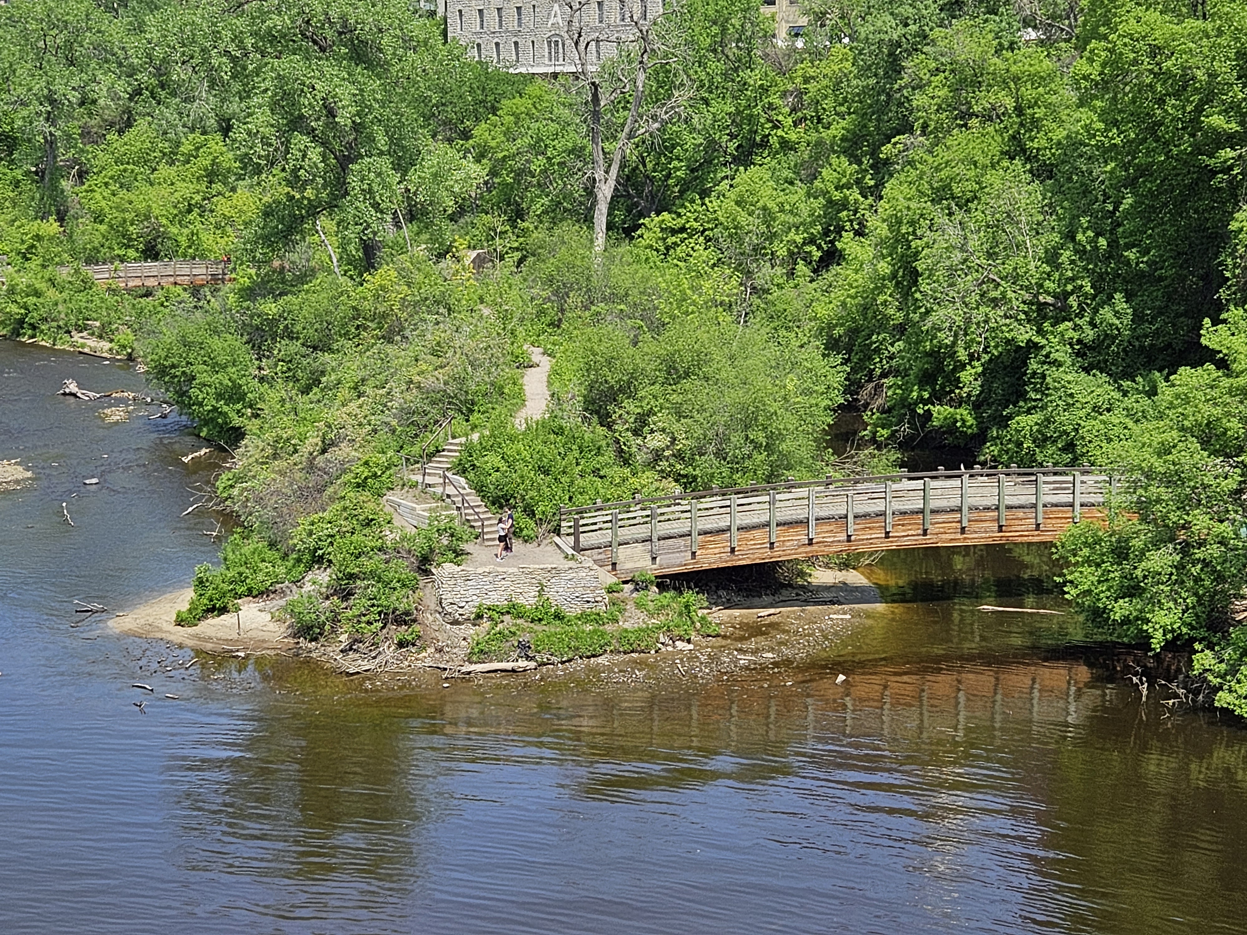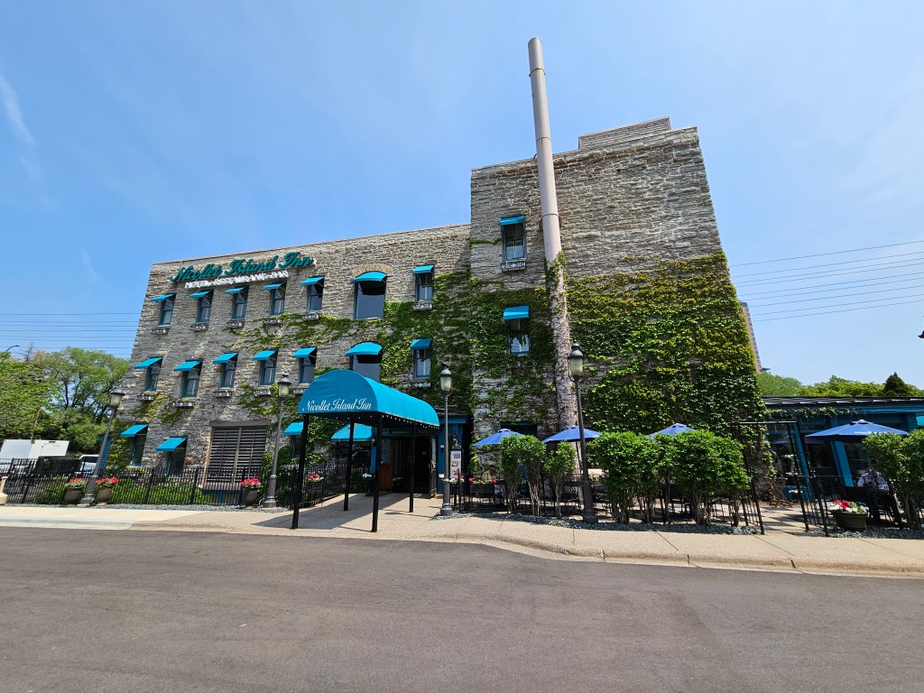 On the St. Anthony Falls site, you can take a trail down to the water, and get a good views of the falls and Minneapolis. We returned to the top, and continued to Nicollet Island, home of the Nicolet Island Inn and DeLaSalle High School.