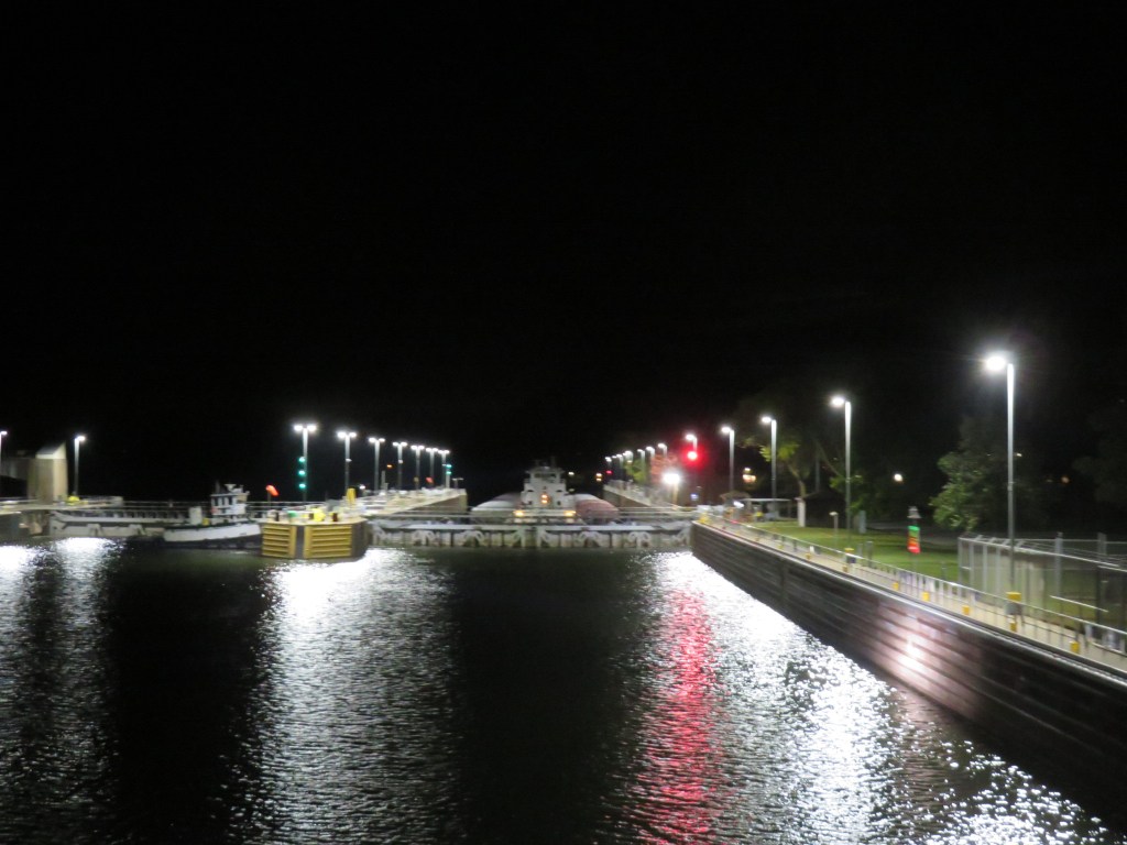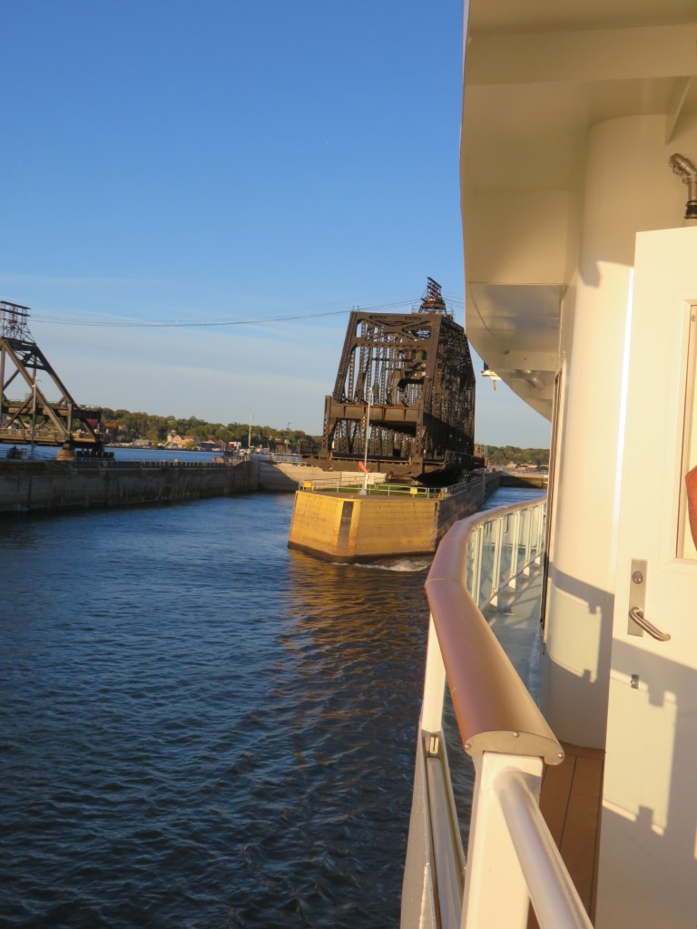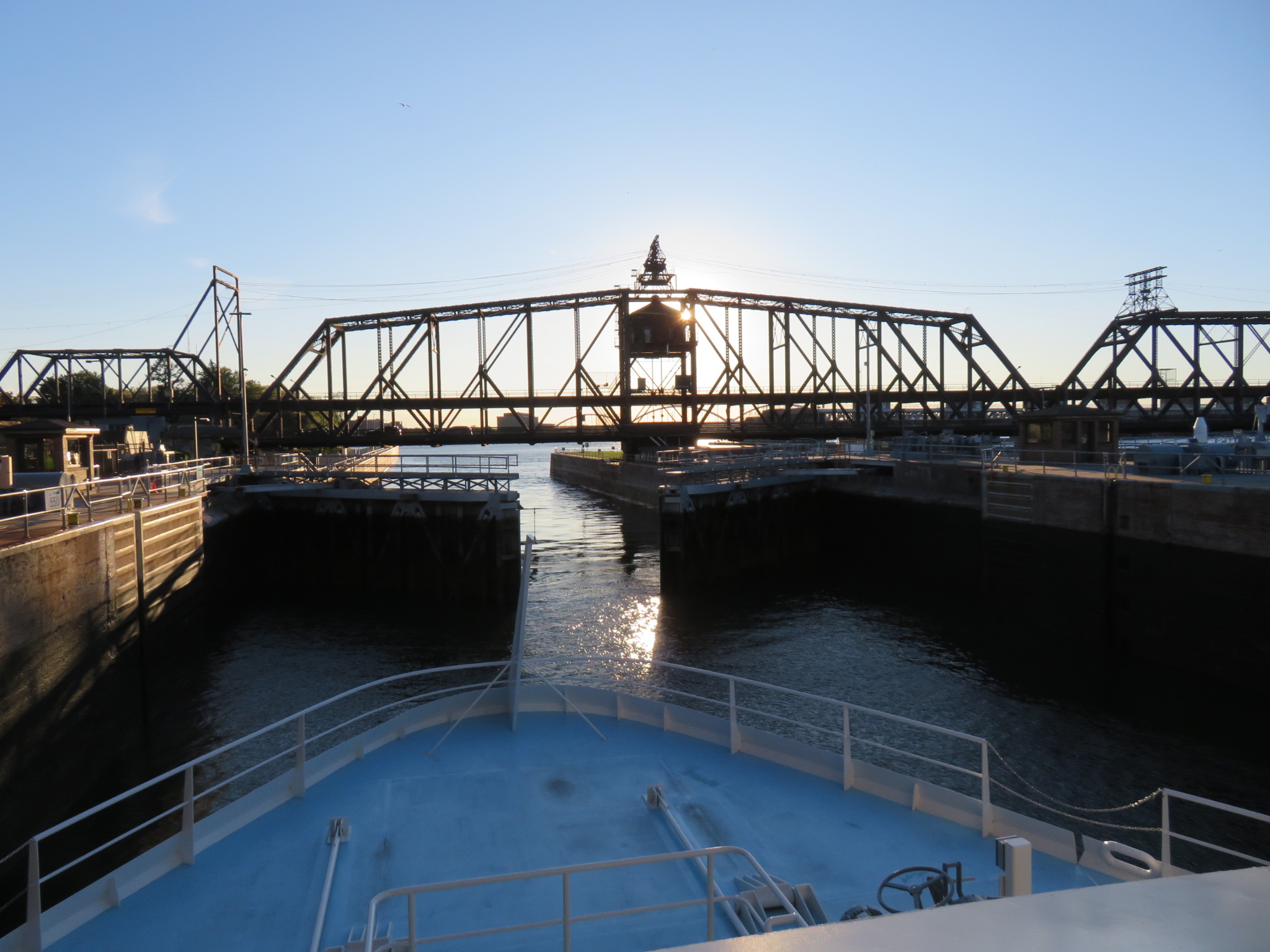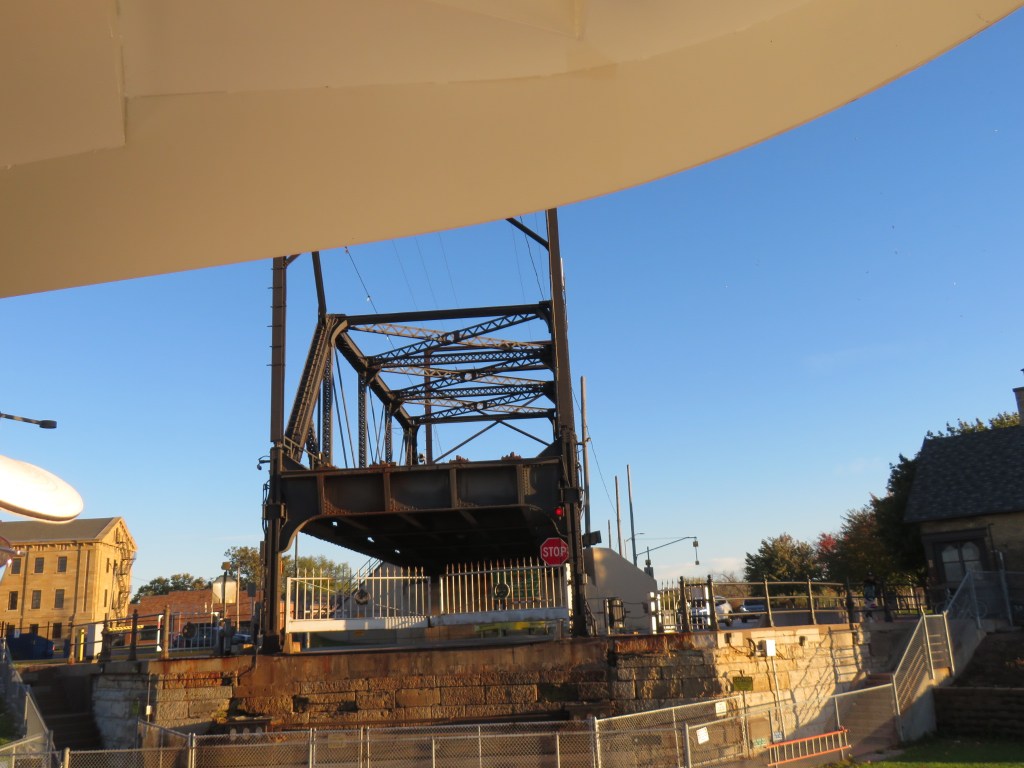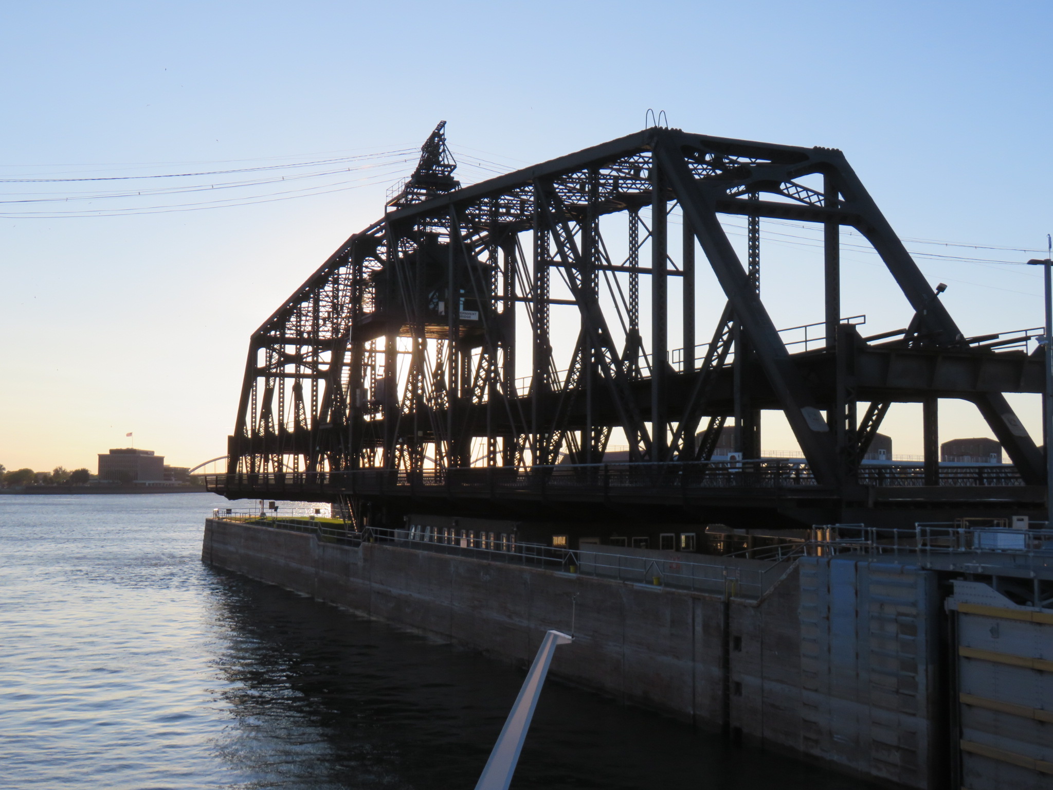 That first railroad bridge has been replaced three times. The current bridge, called the Government Bridge, or the Arsenal Bridge, was built in 1896, and has a 360 degree swing section over Lock Number 15, which we passed through when we left Davenport tonight. The drop here is about eleven feet again. The bridge connects Davenport to the Rock Island Arsenal, the largest government-owned weapons arsenal in the United States, built here in 1862.