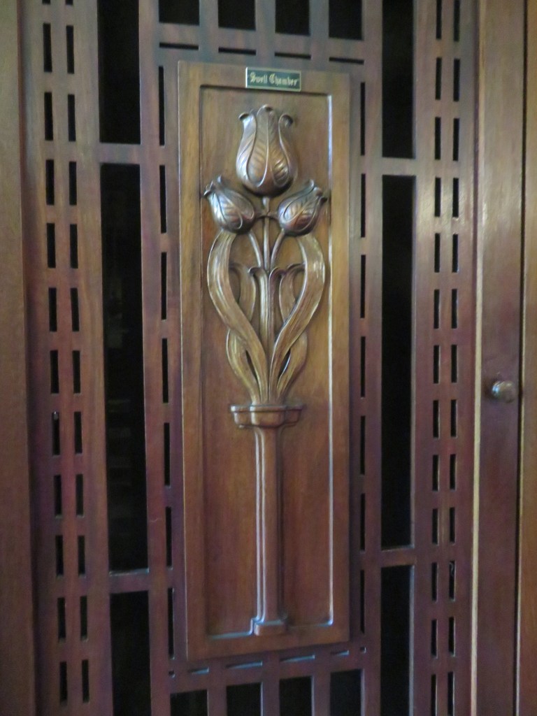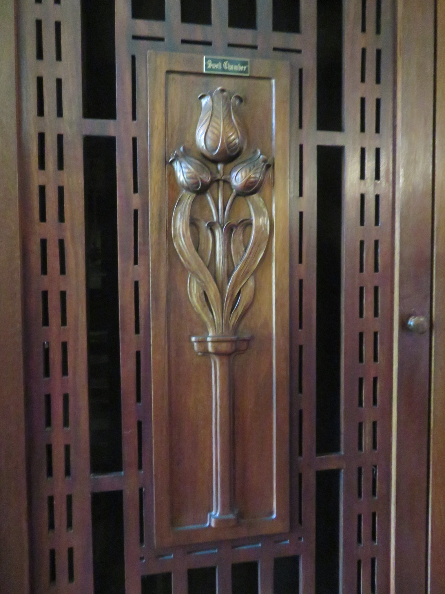 This afternoon, we visited the Hauberg Estate in Rock Island. The house was designed for Susanne Denkmann, by architect Robert C Spencer, a contemporary of Frank Lloyd Wright, in the Prairie style. Denkmann was an heiress of the Weyerhauser-Denkmann lumber business. Shortly after commissioning the house, she met her future husband – John Hauberg. The Haubergs were philanthropists, with Susanne founding the Rock Island West End Settlement and YMCA. After the Haubergs both passed, their children donated their house to the city of Rock Island as a civic and event center.