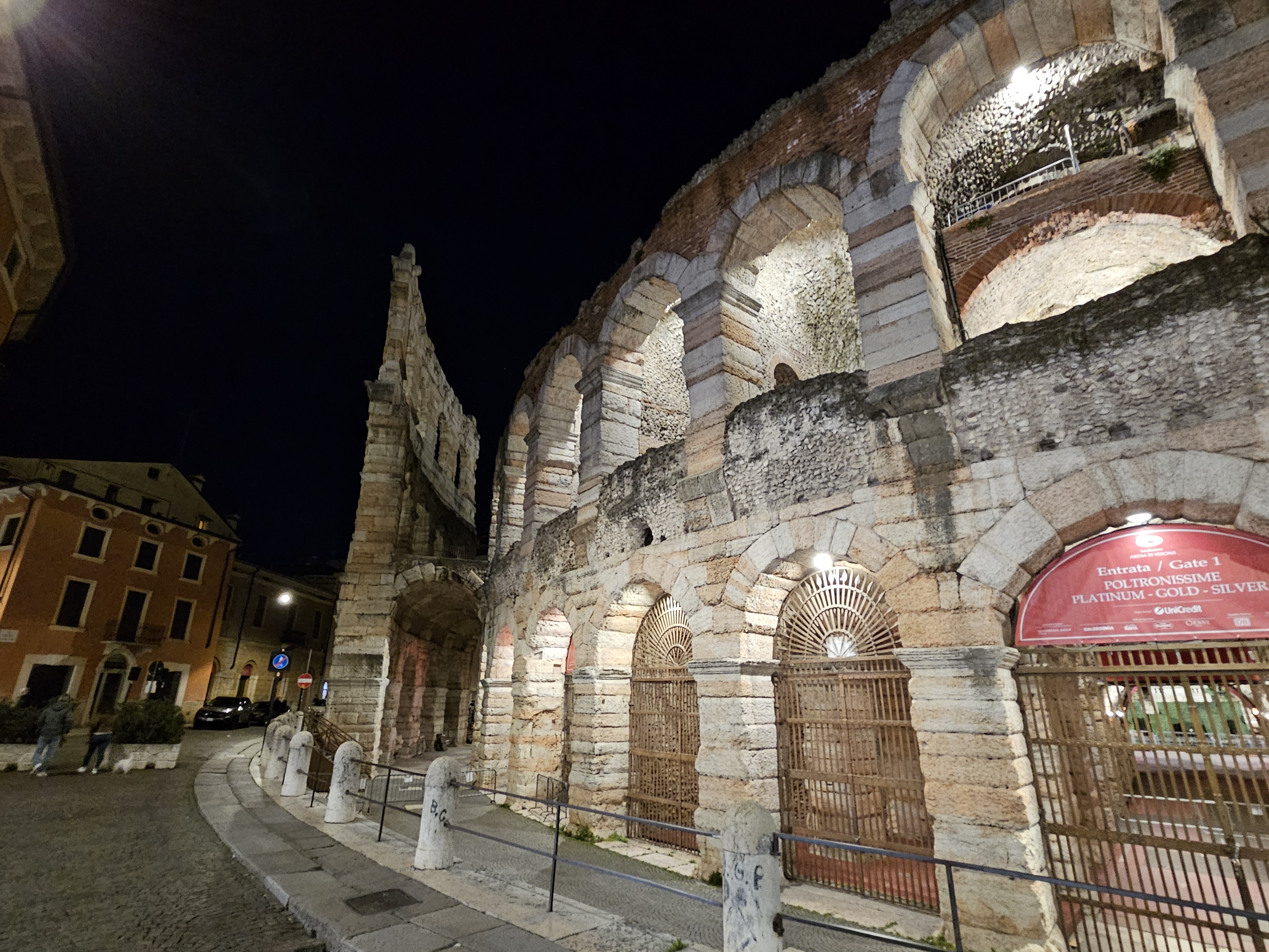 The Verona Arena, built in 30 AD, with a capacity of 30,000, is still being used today for concerts and opera performances. The arena has also hosted international rock and pop bands, including Pink Floyd, Rod Stewart, Michael Flatley, Sting and many more well-known artists. In two years, the arena will be home to the closing ceremonies of the 2026 Winter Olympics and the opening ceremonies of the 2026 Winter Paralympics. We passed by the Arena during the day, and found it to be very impressive. It sits on the edge of the busy shopping area of Verona, across from several lively restaurants.