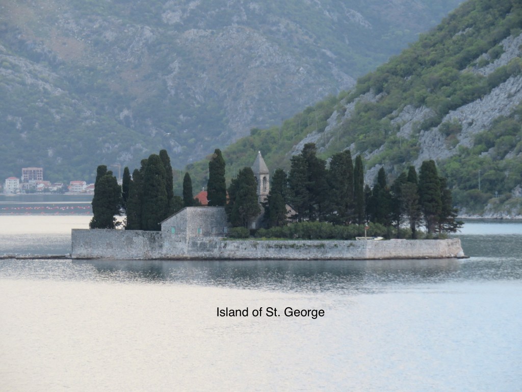 As we approached Kotor, we passed by two islands, one natural and one artificial. Our Lady of the Rocks was created after local seamen found an icon of the Madonna and Child on the rock in the sea on July 22, 1452. After returning from a successful sea voyage, sailors would lay another rock in the bay. Over time, the accumulation of rocks resulted in an artificial island. At some time, a tiny Orthodox chapel was built here, then replaced by the Venetians with a Catholic chapel in the 1600s. Every year, on July 22, local citizens take their boats there and throw rocks into the sea.The other island, St. George, is home to the Monastery of St. George, built in the 12th century.
