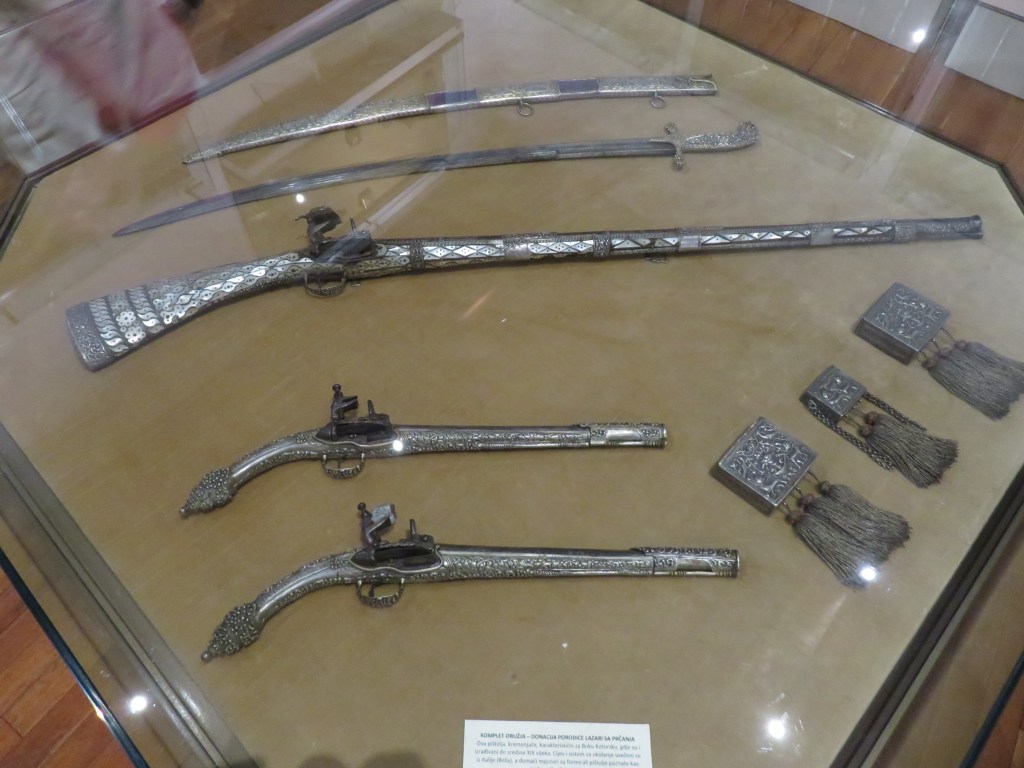 We also visited the Kotor Maritime Museum, established around 1880 with many artifacts from that time and earlier, most related to the maritime industry, but also some cultural items such as furniture, dishes and regional costumes. Before viewing the exhibits, we were distracted by a small marching band that marched through the square outside the front door. We don’t know what the occasion was, but we enjoyed the very short performance.