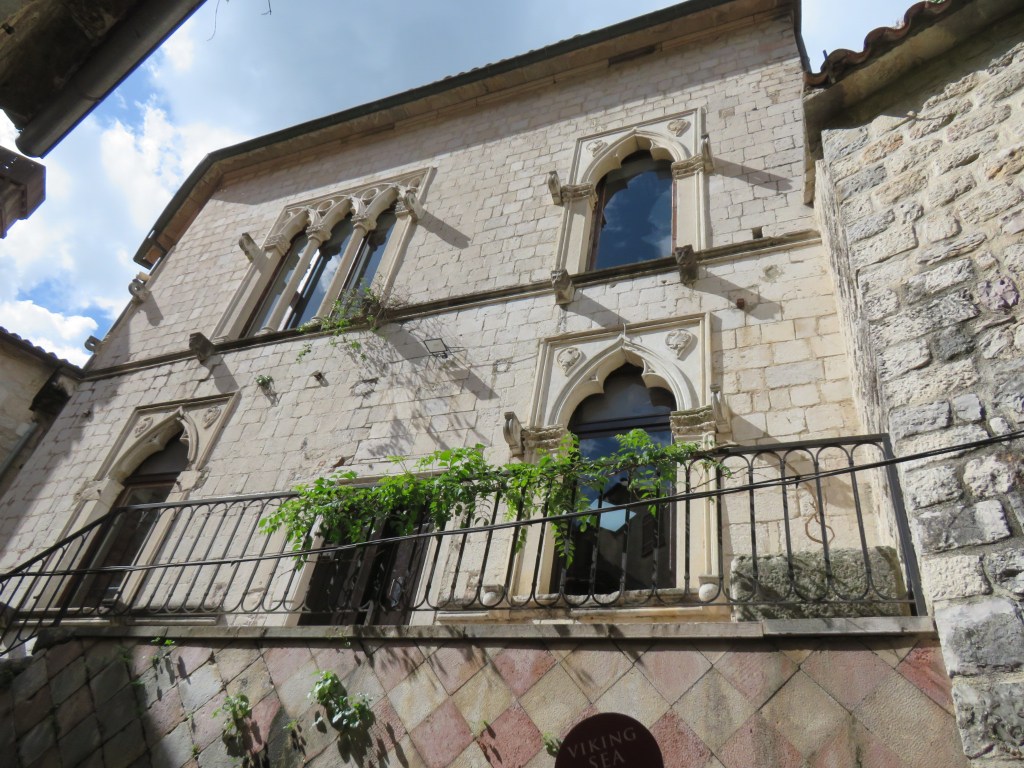 Our guide this morning addressed our group as “My Dear and Beautiful People,” and we did indeed feel dear and beautiful for an entire day. As part of our walking tour of Kotor, we visited the Cathedral of St. Tryphon, constructed in the Romanesque style around the 12th century AD. It is one of the largest and most ornate buildings in the town. It had been seriously damaged in the earthquake of 1667, and was partly reconstructed. Another earthquake, in 1979, caused more damage. Restoration was completed only a few years ago.The Cathedral contains frescoes from the 14th century, as well as many ornaments and figures in relief (including saints in gold and silver.)