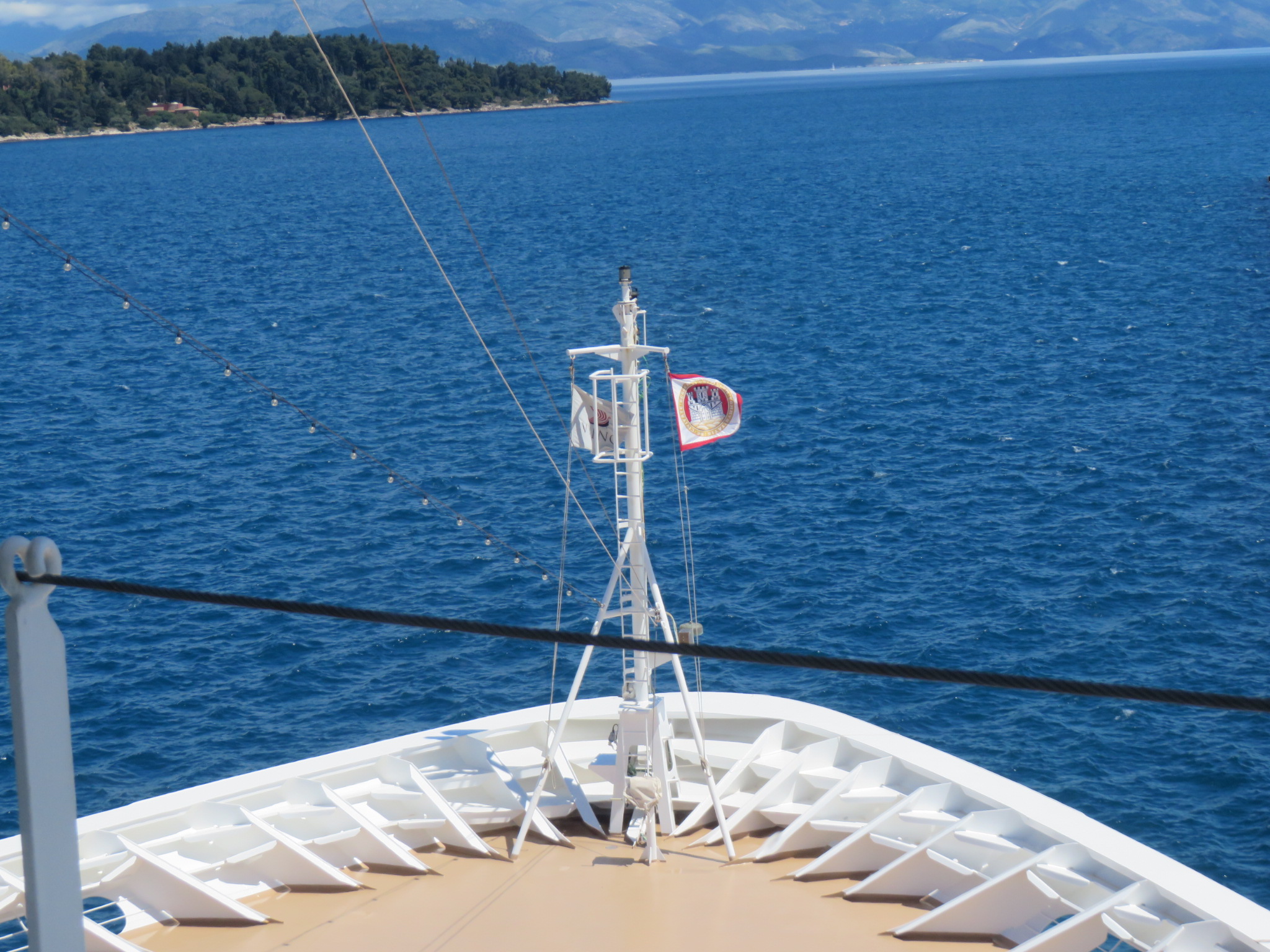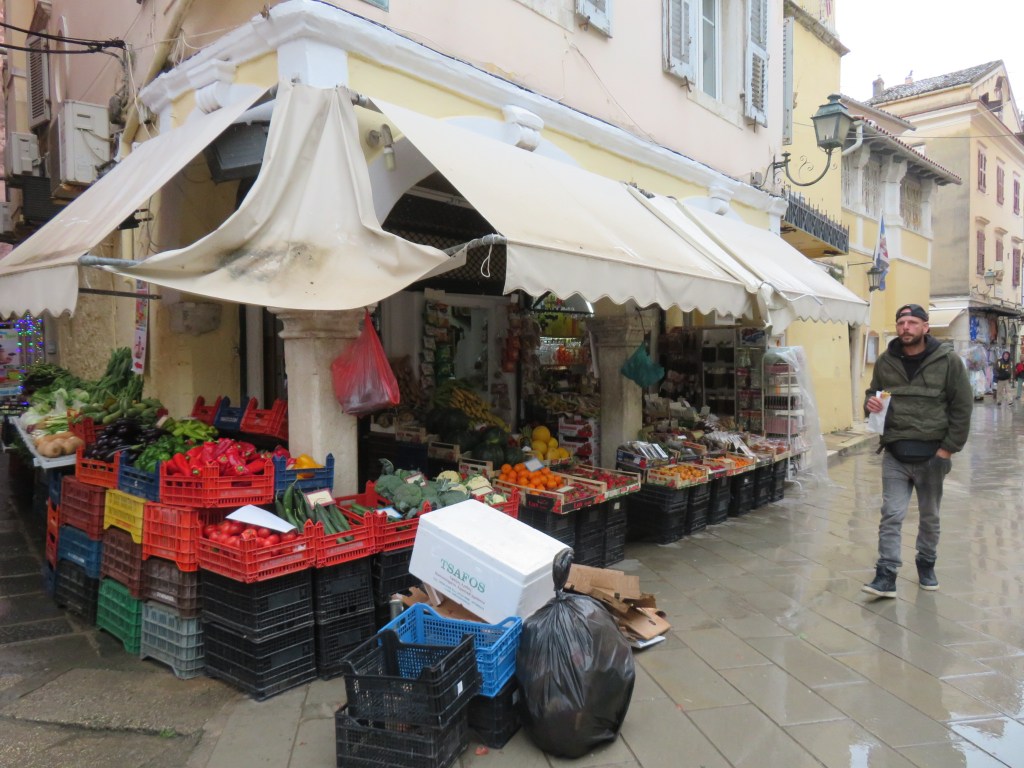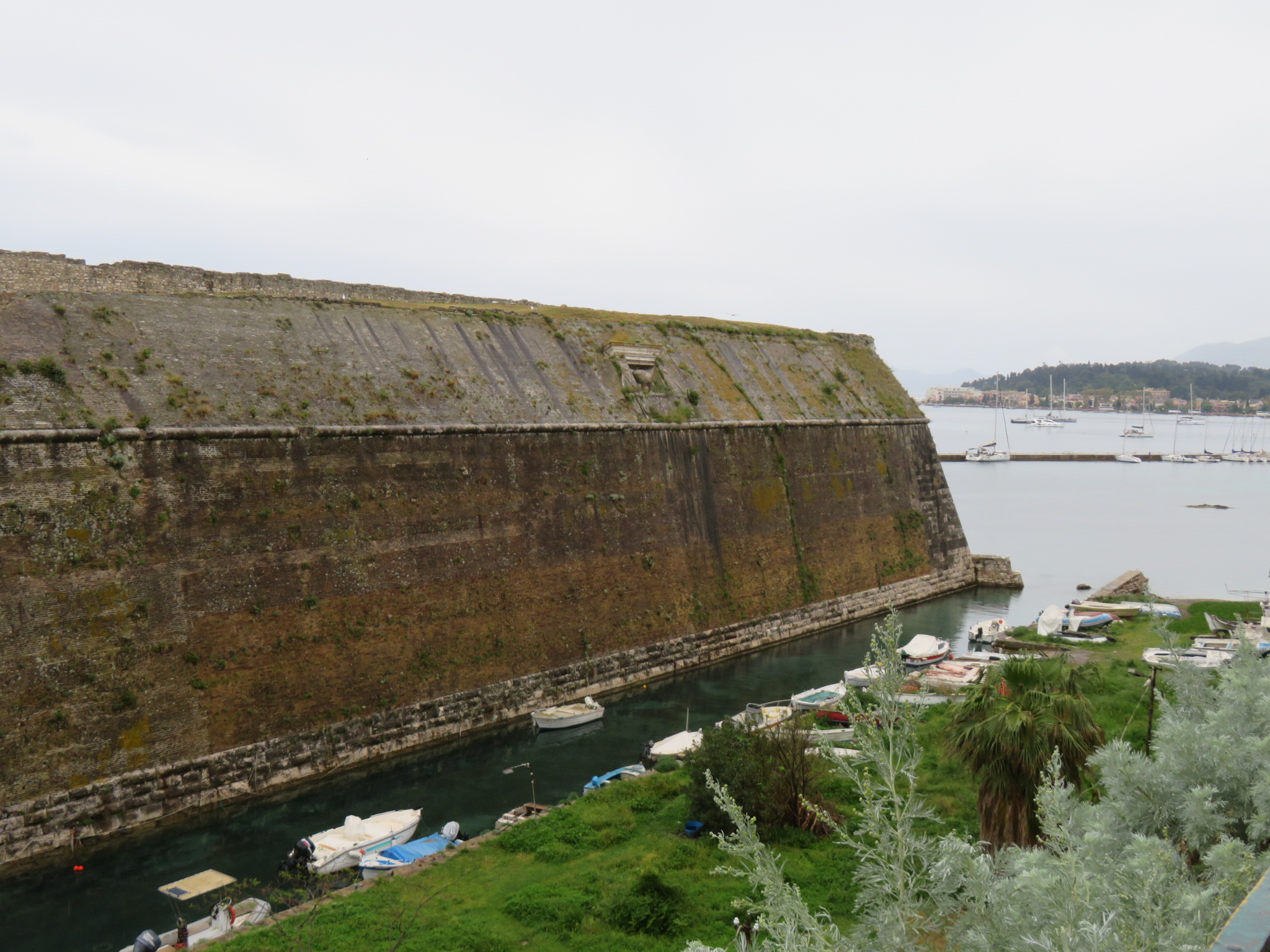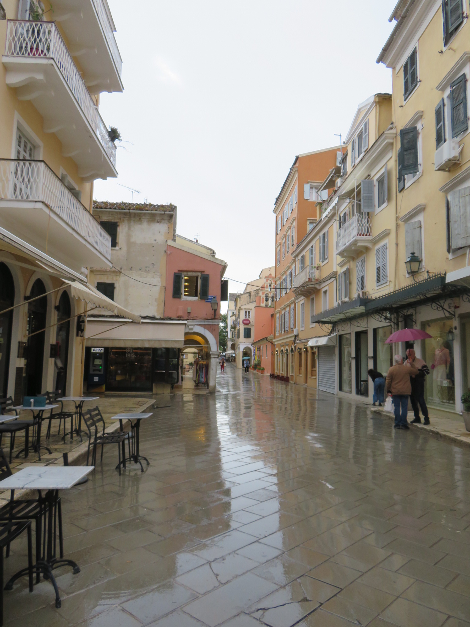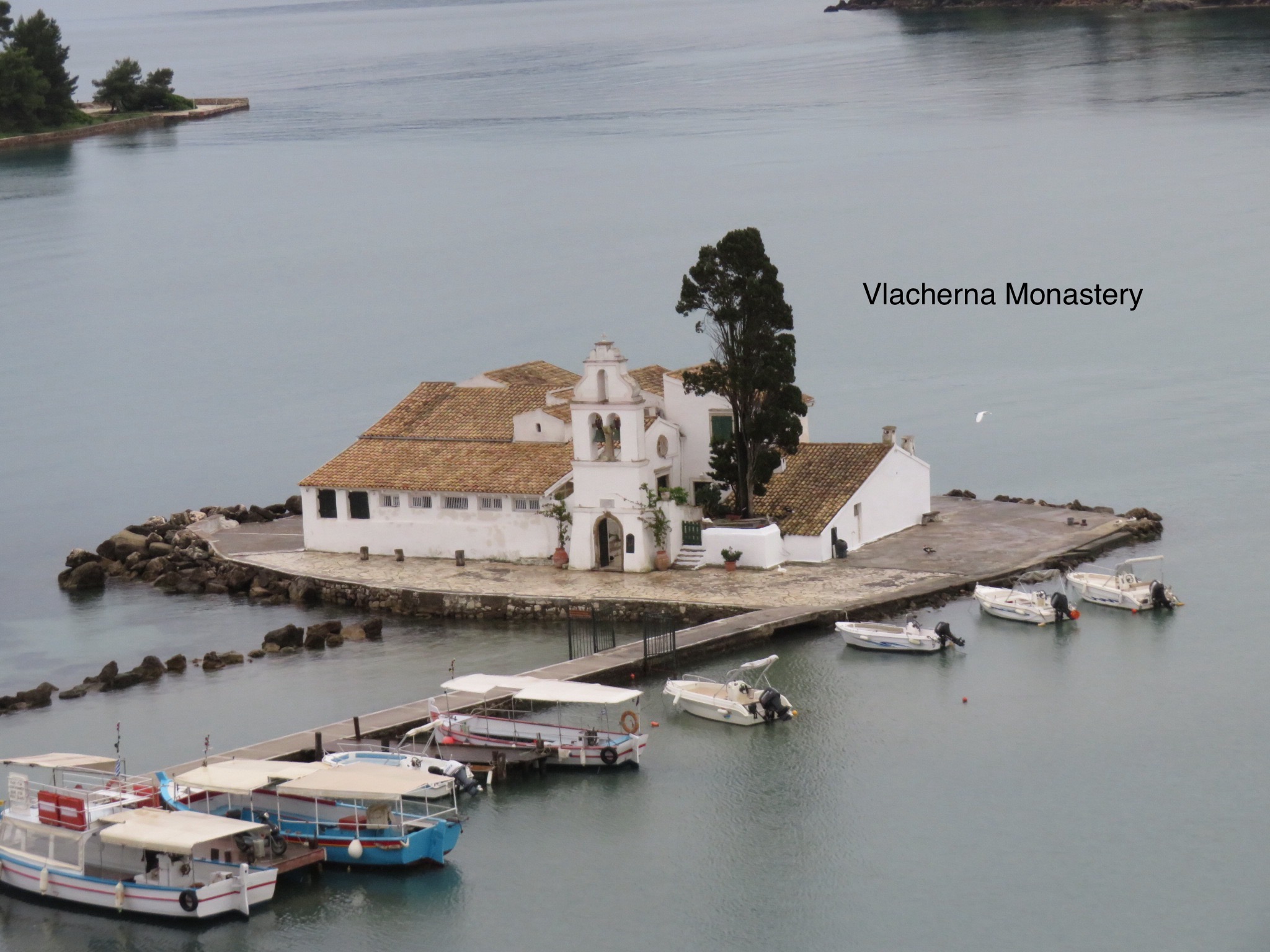 Corfu’s Old Town is a UNESCO World Heritage Site. We took a short ride to Kanoni, for photo ops of the surrounding islands, really just a “stop, focus and shoot,” no time to actually look at anything, plus it was raining. Oh well, we did see a couple of islands. The Vlacherena monastery, founded many centuries ago on a rocky island as a women’s monastery, is now joined to the mainland by a footbridge. Mouse Island (Pontikonisi in Greek), called that because of its shape, is home to a Byzantine chapel. Legend says that the island was formed when the boat of Odysseus was turned into this green rock by Poseidon.