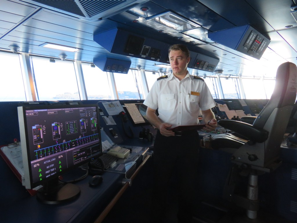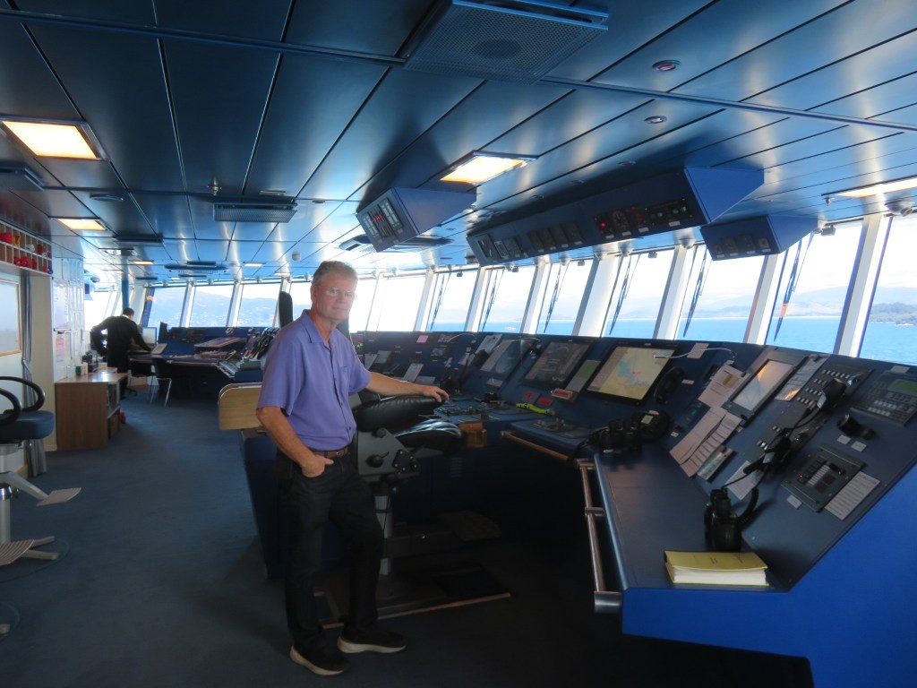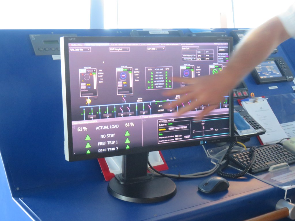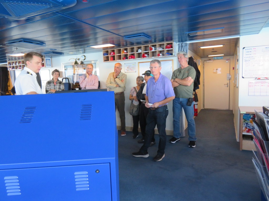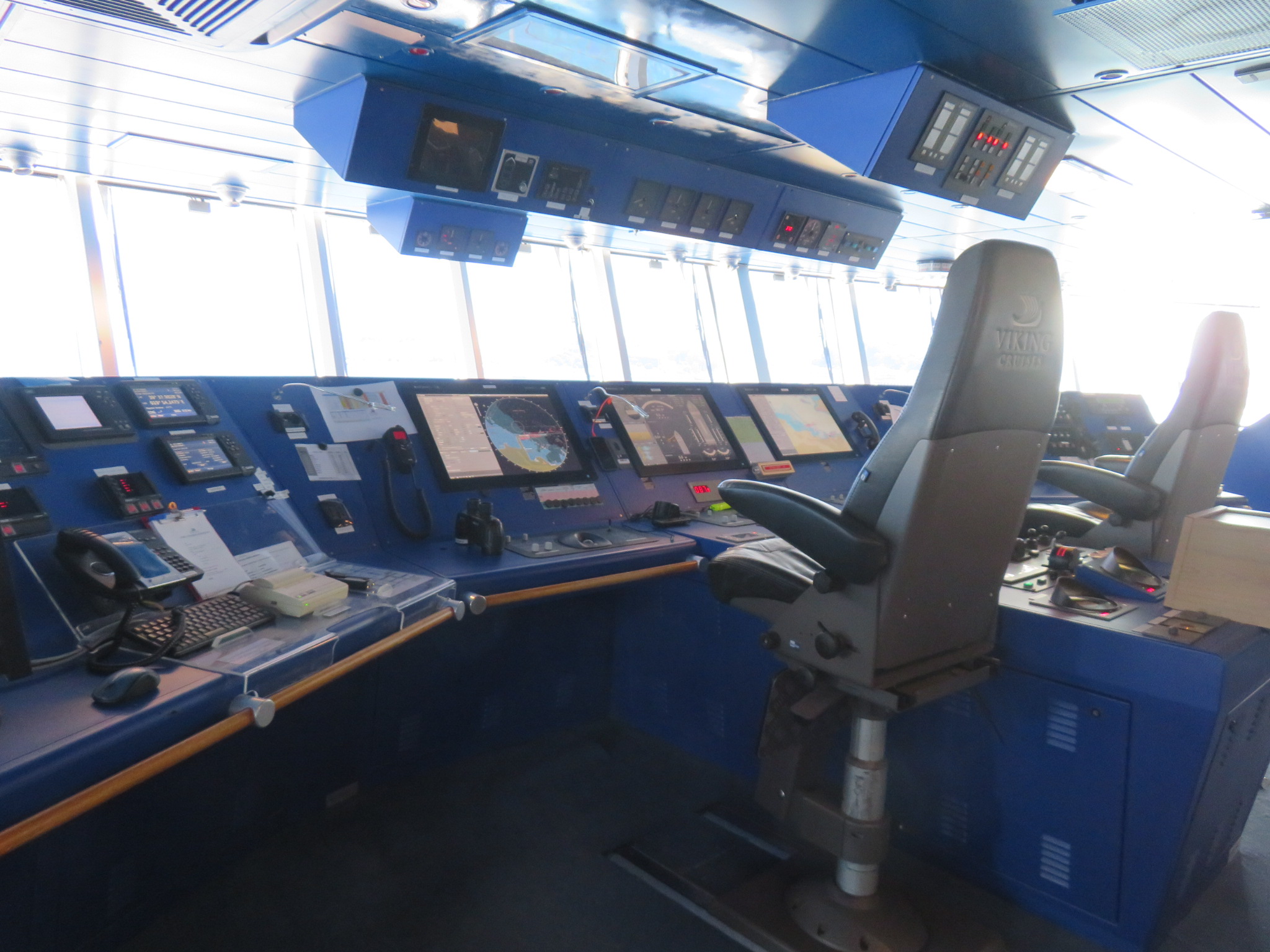 We returned to our ship in time to participate in a bridge tour, where we got to see some of the equipment used in steering, hear about the types and quantities of fuel needed to keep her going, and even about processes to clean the bilge water before it is returned to the sea.
