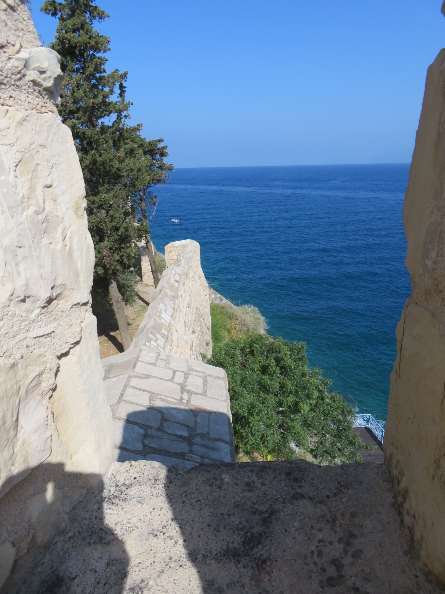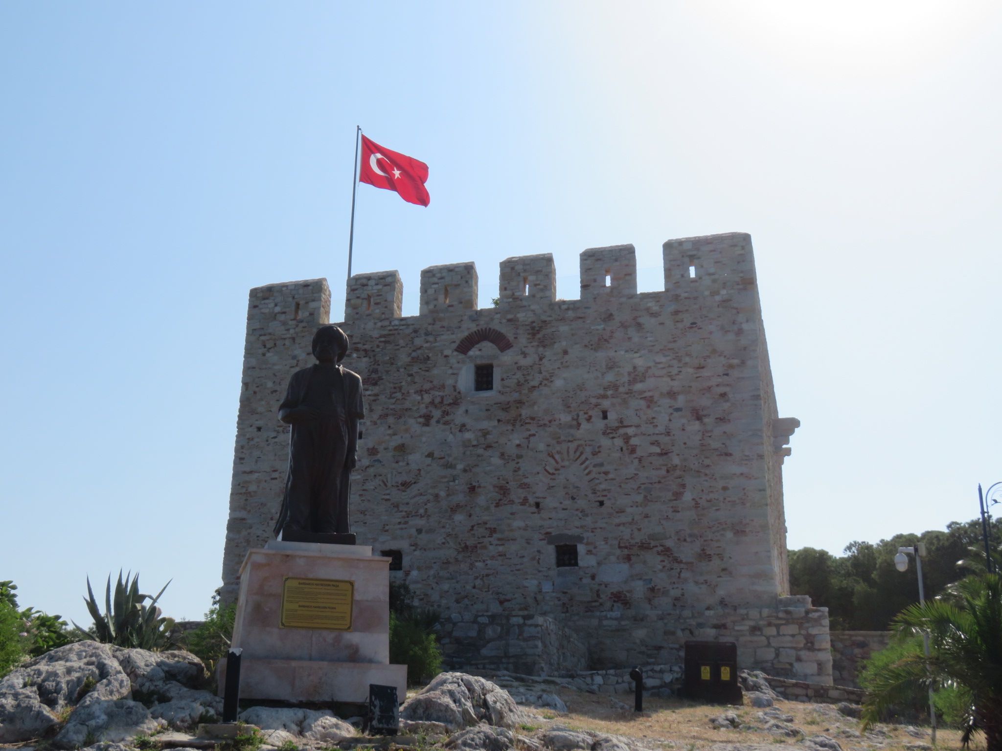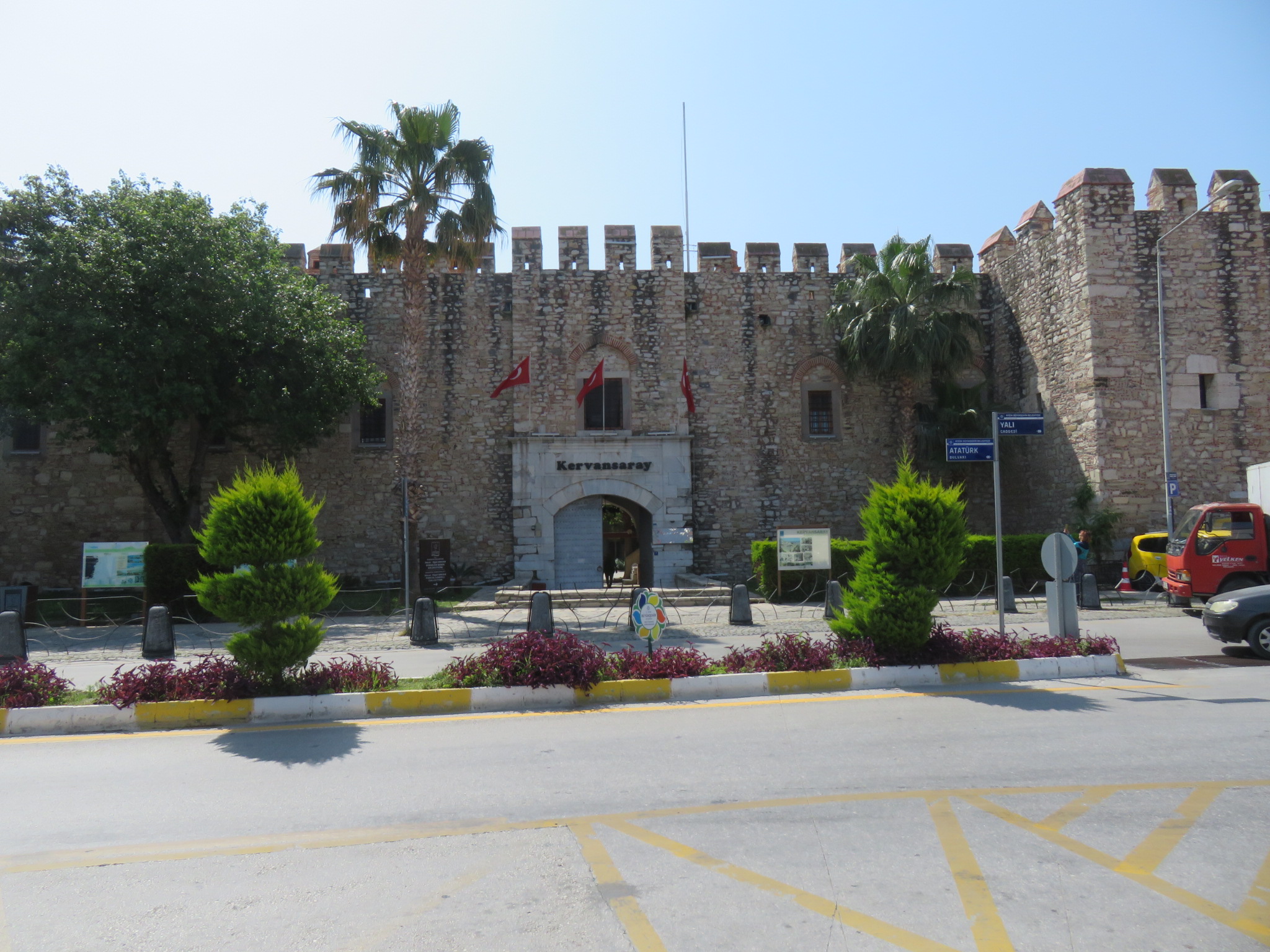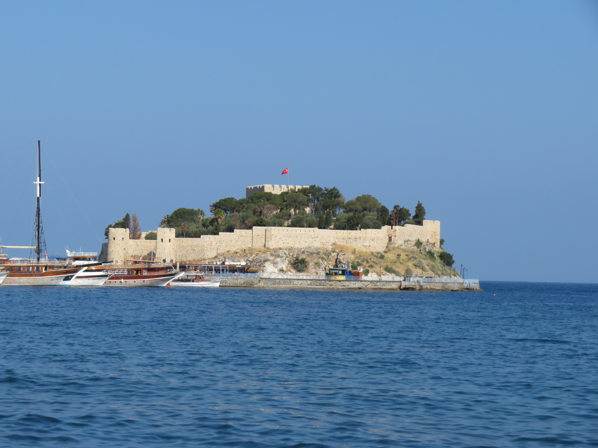 A popular resort community, people have lived in this area for at least 5,000 years. The name Kuşadası (pronounced koosh-a-das-uh) comes from two Turkish words, kuş (bird) and ada (island.) The island, where a 13th century Byzantine fortress is located, was thought to resemble a bird when viewed from the sea. We took a short walk from the ship, and then crossed to the island via a causeway. This is a beautiful, peaceful place, and for us, a way to escape the clamoring taxi drivers and merchants constantly accosting us. They do have to make a living, I guess.