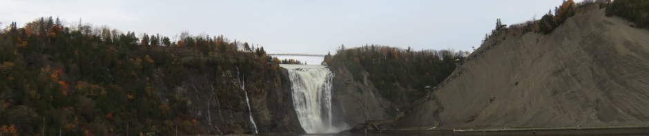 Our first stop, Montmorency Falls, is located in the City of Québec, near where the Montmorency River meets the St. Lawrence. The falls plunge over 270 feet into the St. Lawrence River, a longer drop than that of Niagara. A footpath and suspended bridge offer views of the falls and surrounding area. We had considered taking a cable car to the top of the falls, but it was quite cold out today, so we simply walked the boardwalk along the bottom.