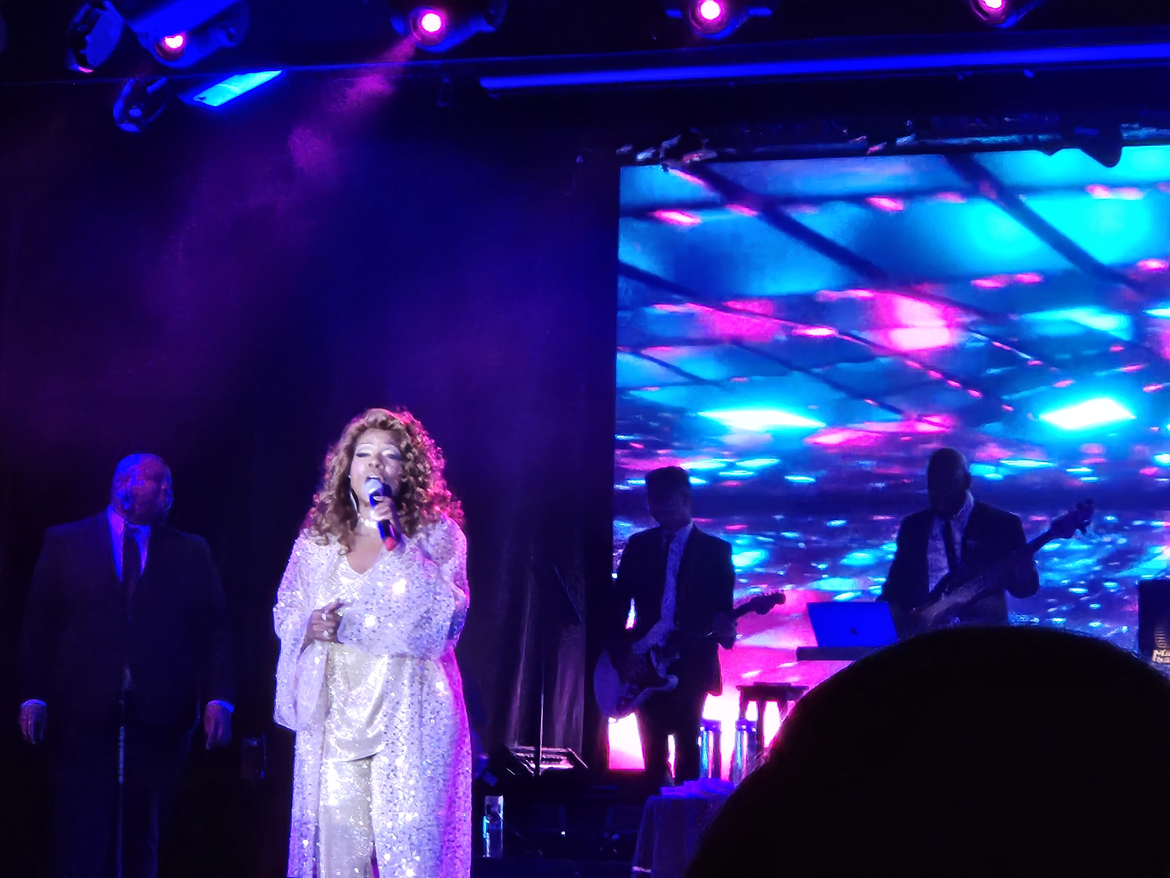 Tonight’s entertainment was outstanding. Gloria Gaynor, best known for her hit “I Will Survive.” She, along with her band and backup singers, entertained us for over an hour, inviting us to sing and dance along – which we certainly did. During the show, Ms Gaynor generously allowed each one of her crew the opportunity to shine. This group is loaded with talent,