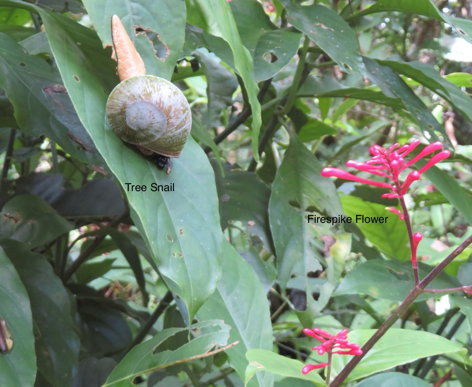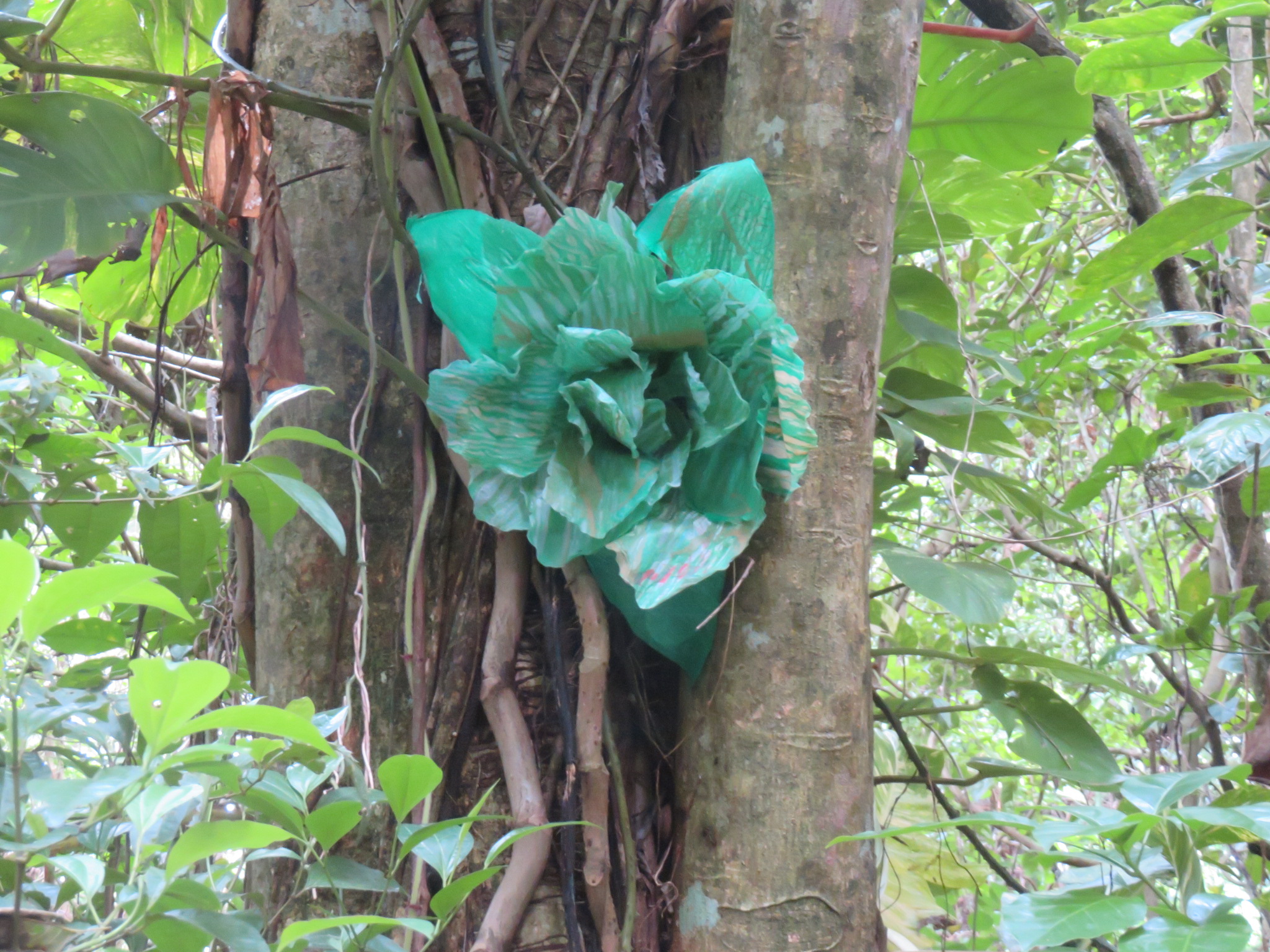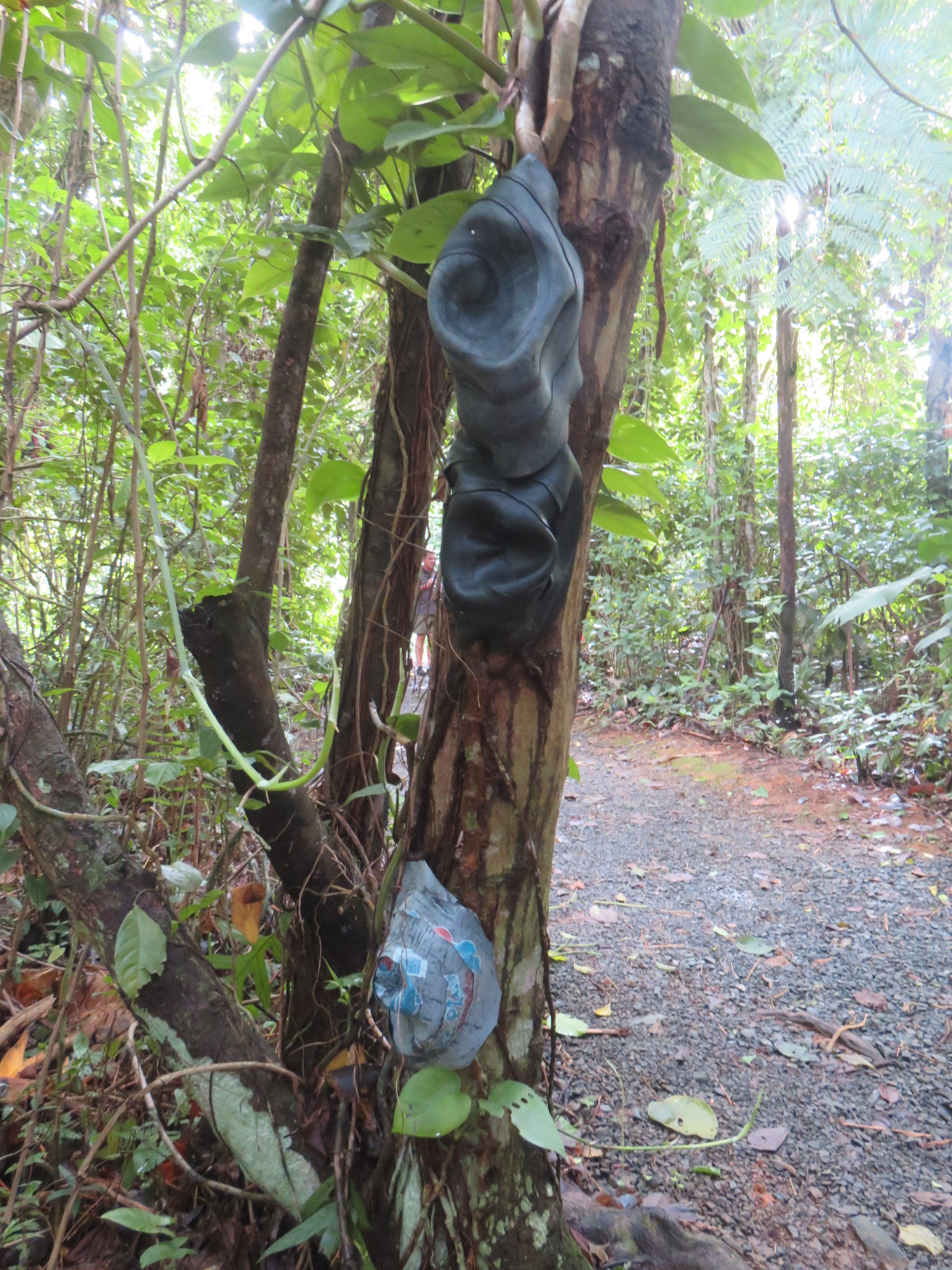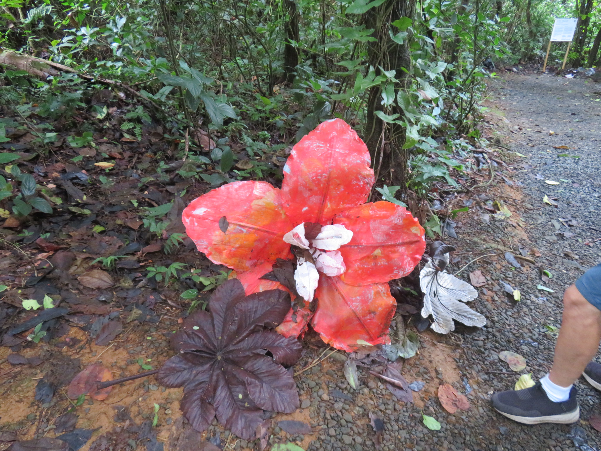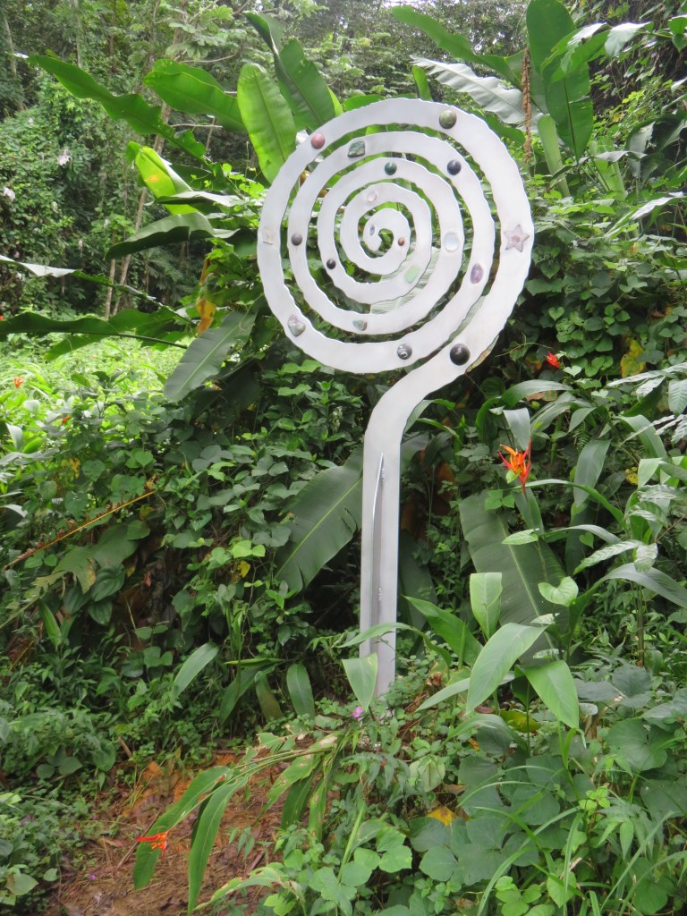 Today we hiked in the Tabonuco forest area. The area has over 170 species of trees. The 1.8 mile La Coca trail (sadly, not open at this time) passes through dense forest foliage, crossing numerous streams, passing waterfalls, leading to the Mameyes Wild & Scenic River area, one of the rainiest parts of El Yunque. Discovery Trail features several pieces of art by local artists.