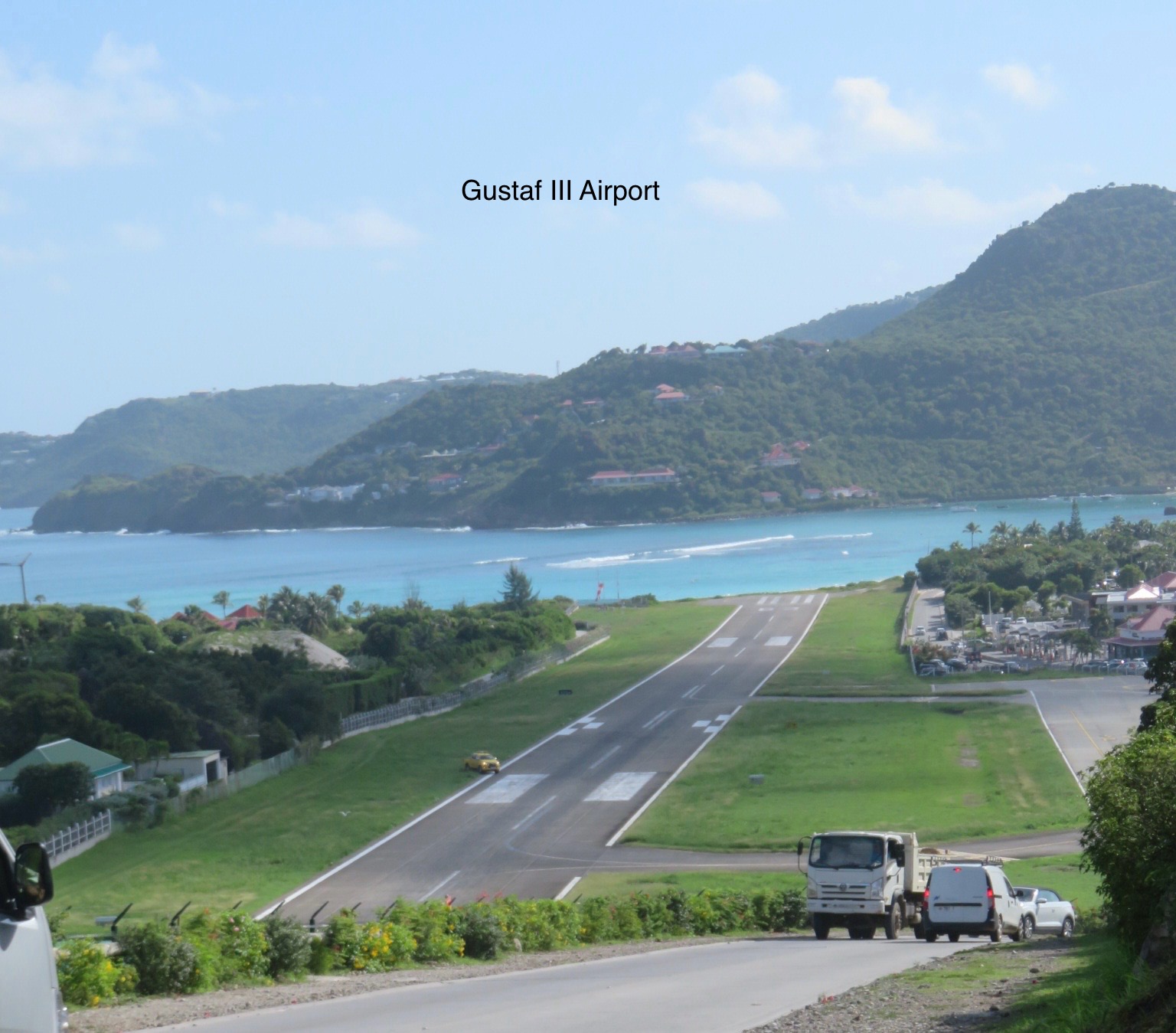 St. Barths has a tiny airport, Gustaff II Airport, with a steep runway, about 2,100 feet long, ending on the beach. Clearly, it cannot accommodate large aircraft, most carry 20 or fewer passengers. The largest plane to land there was a Douglas DC-3, but only once. In the past, cars drove on a road that passed directly under the approach path, but the road was moved about 20 years ago. At one time, the History Channel ranked it the third most dangerous airport in the world, but most experts consider it to be extremely safe. In any case, special certification is required for permission to land there. Last year, over 200,000 passengers landed here safely.