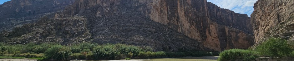 From here, we drove to Santa Elena Canyon for one of the most impressive scenes in the park. This canyon was formed by the Rio Grande River, with limestone cliffs of up to 1,500 feet in height. The canyon is 8 miles long, a popular spot for hiking, kayaking, rafting, canoeing and wildlife viewing. The river seems calm today, but that can change during heavy rains. The road we drove on is peppered with signs warning of potential flooding. No rain in sight today.