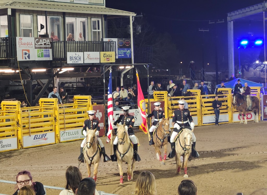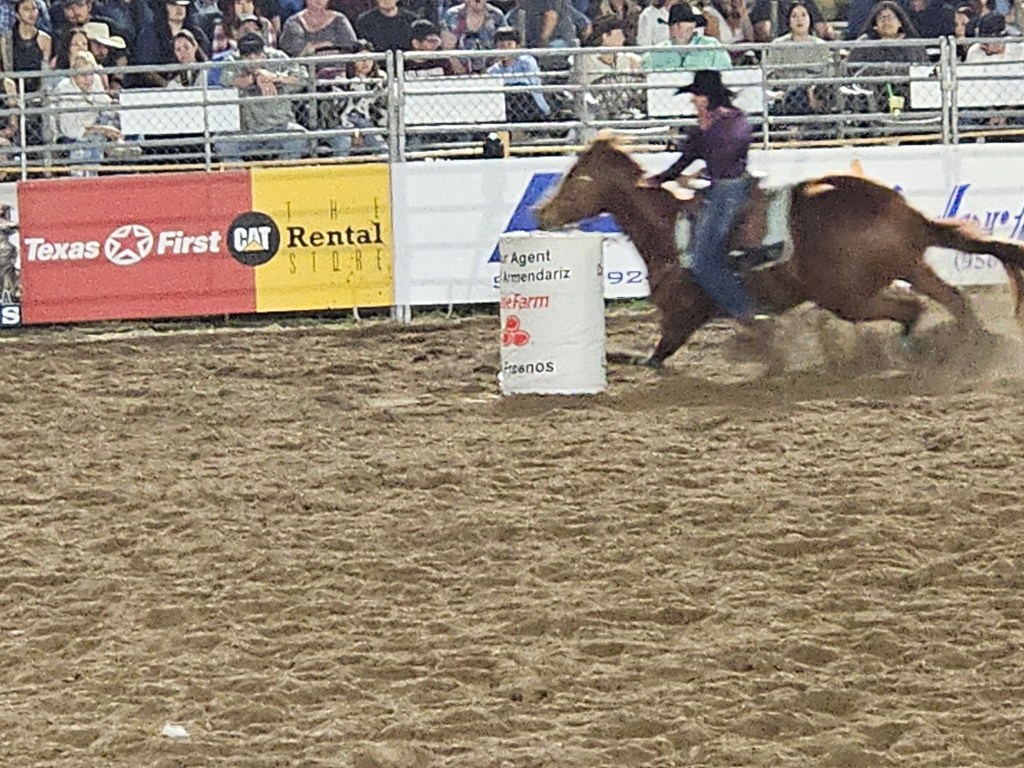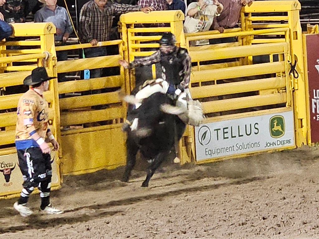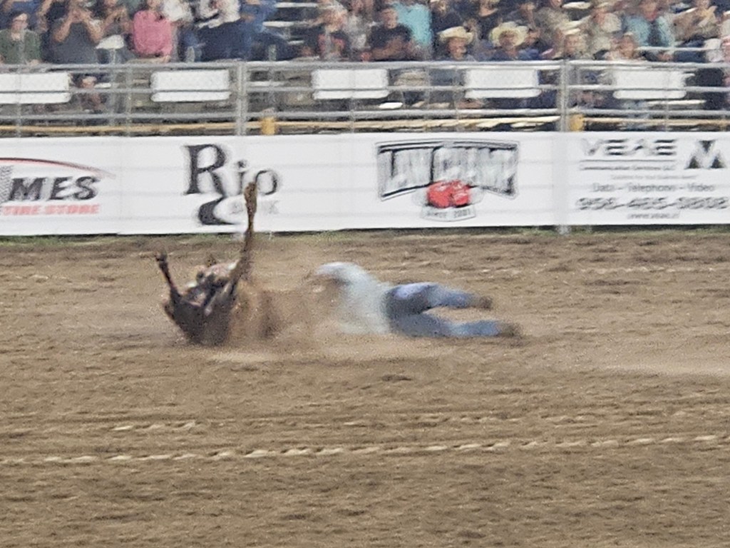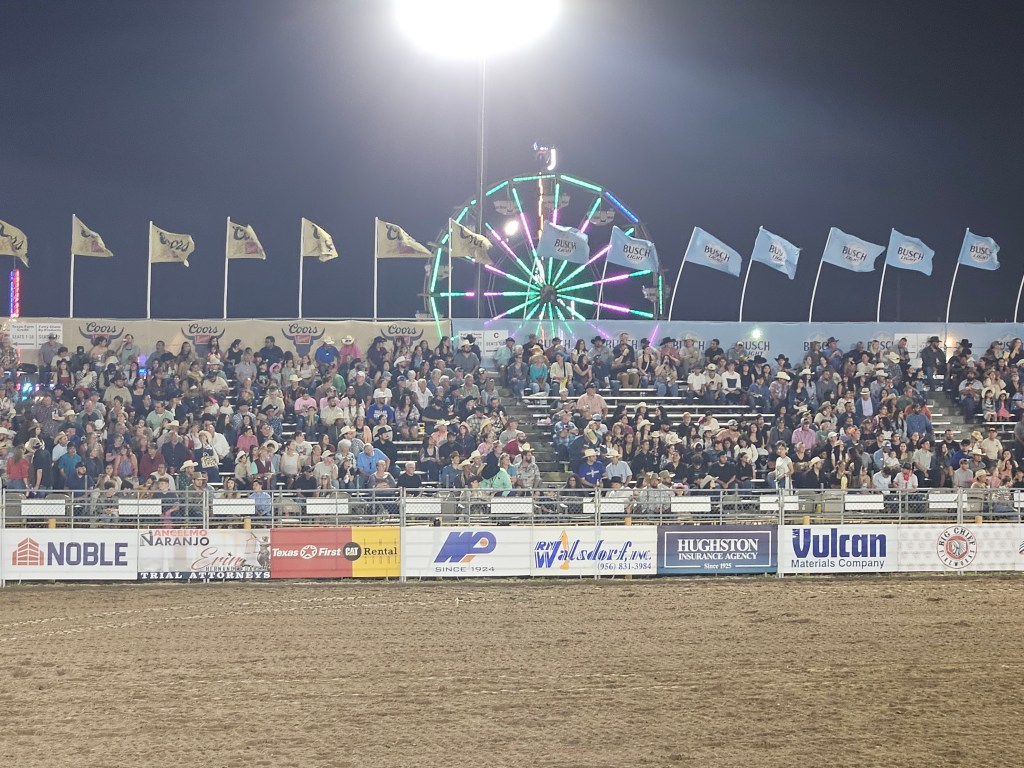 We had never been to a rodeo, which seemed almost disgraceful since we have been spending a couple of months each year in Texas since 2020. We decided to remedy the situation when we learned about the Los Fresnos Rodeo, which bills itself as the “Biggest Little Rodeo in Texas.” This is the 36th year of the Los Fresnos Rodeo, and the arena was near its capacity of 600, people of all ages. This is definitely a family event, lots of food and beverages, plus several midway rides. The weather was perfect, in the upper 70s, with a gentle breeze. Humidity was high, though, which affected the quality of the photos. Still, who can complain when the weather back home was freezing!