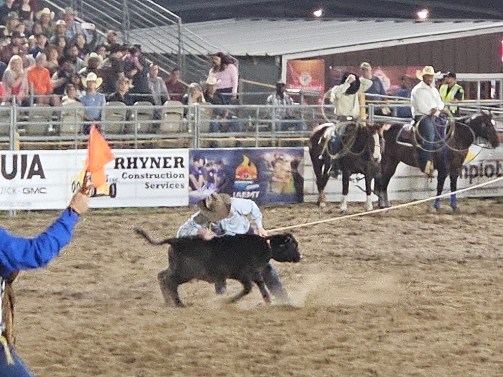There were several events during the night: Team Roping, where one rider attempts to rope one or both horns or the head, and the other one or both back legs; Breakaway Roping, where the calf remains free after roping; Saddle Bronc Riding, with the rider holding on with only one hand for a short but rocky ride; Tie Down Roping, where the rider chases the calf, ropes it (hopefully), and then ties three legs together; and Barrel Racing, fast, fast, fast ride circling each of three barrels without knocking any over.