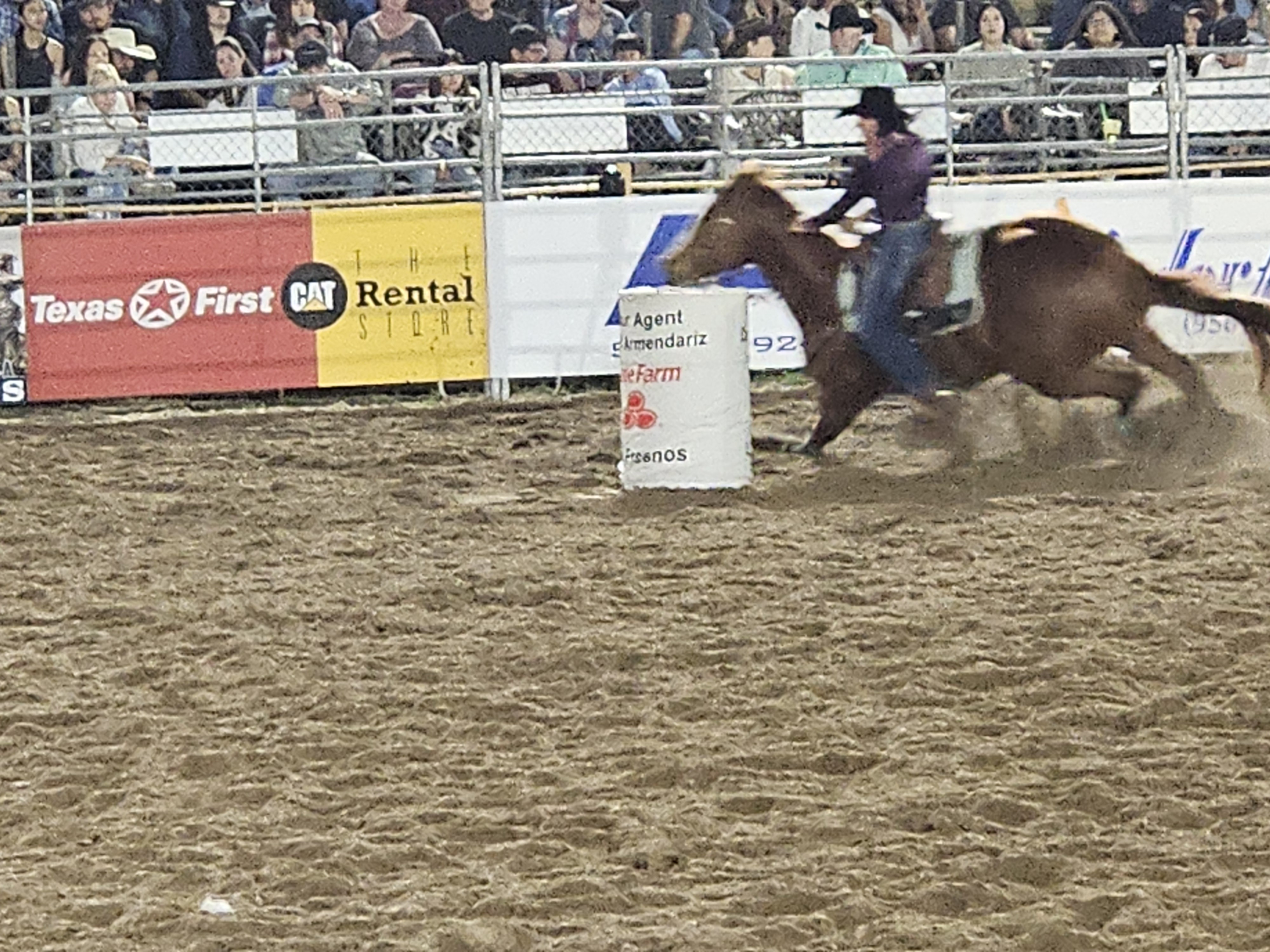 There were several events during the night: Team Roping, where one rider attempts to rope one or both horns or the head, and the other one or both back legs; Breakaway Roping, where the calf remains free after roping; Saddle Bronc Riding, with the rider holding on with only one hand for a short but rocky ride; Tie Down Roping, where the rider chases the calf, ropes it (hopefully), and then ties three legs together; and Barrel Racing, fast, fast, fast ride circling each of three barrels without knocking any over.